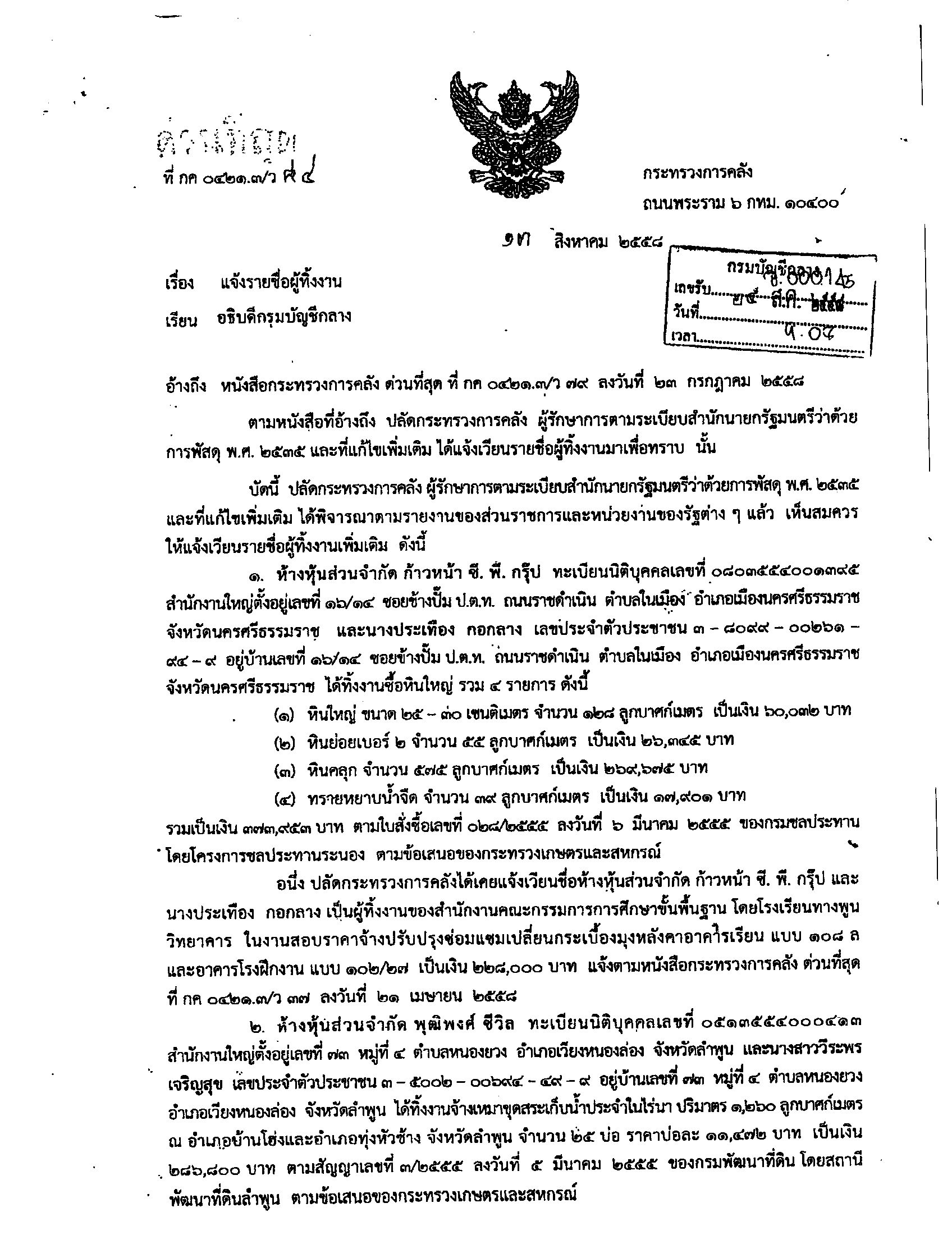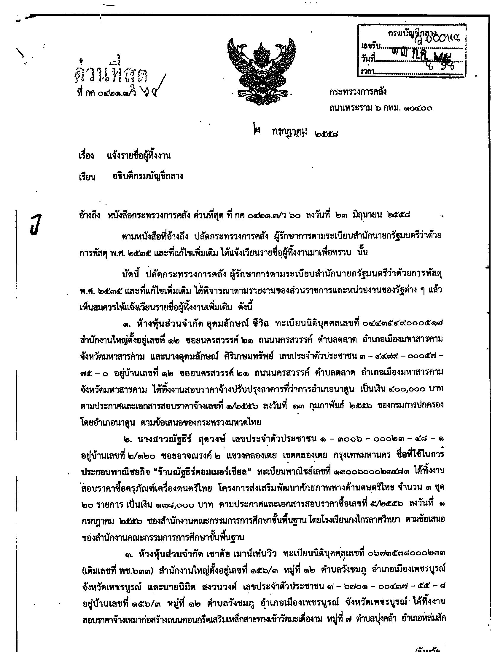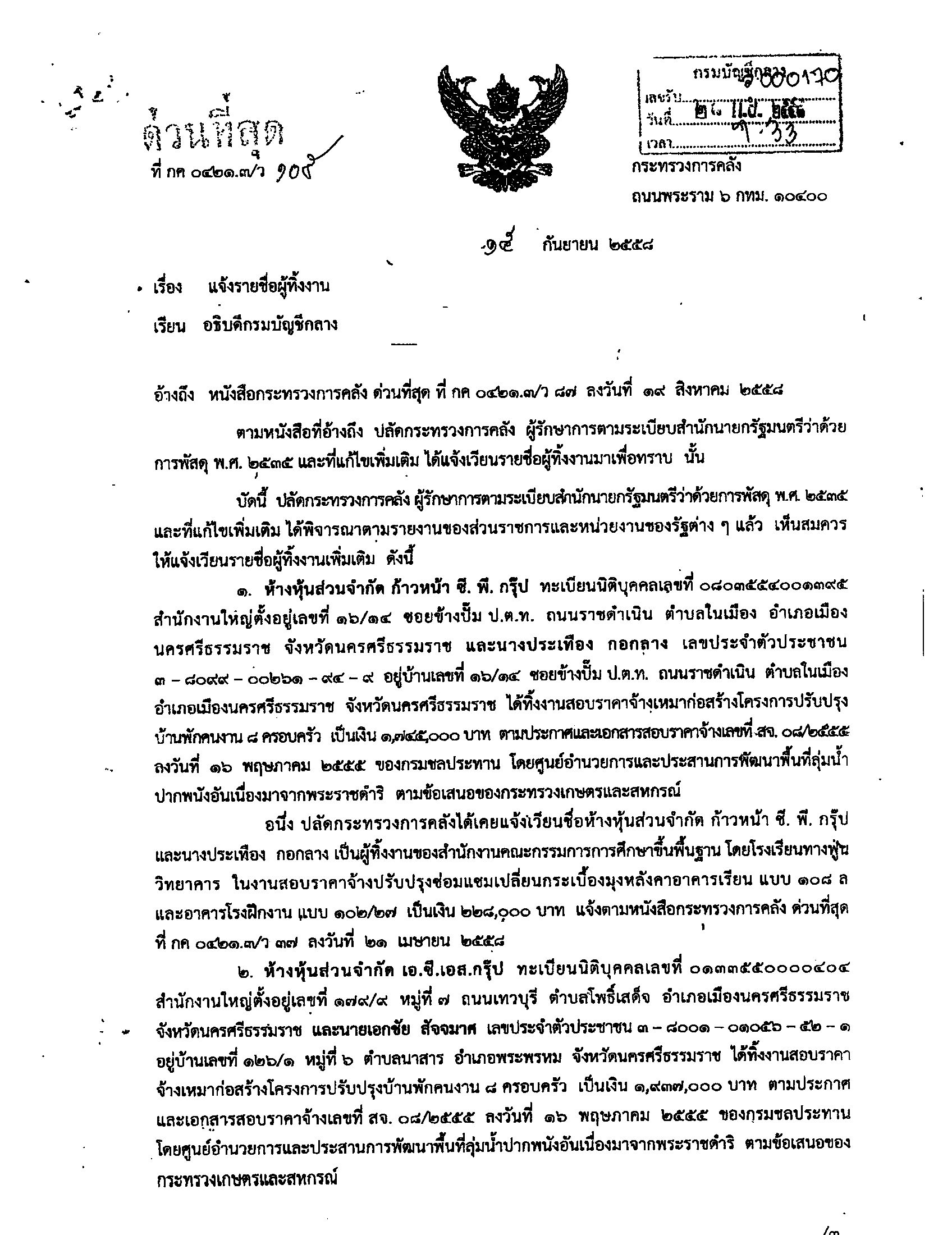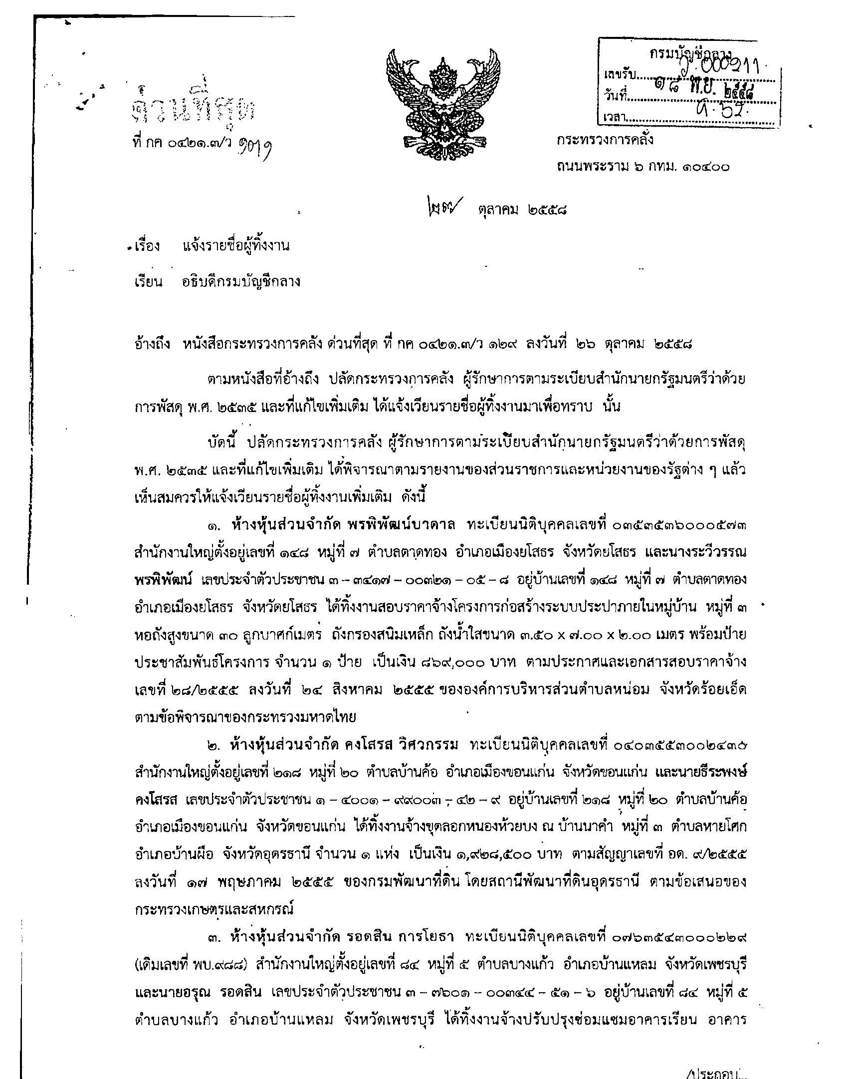 คำวินิจฉัยคณะกรรมการว่าด้วยการพัสดุ กรมบัญชีกลาง ด่วนที่สุด ที่ กค (กวพ) 0421.3/ว 380 ลงวันที่ 16 ตุลาคม 2556 เรื่อง แจ้งรายชื่อผู้ทิ้งงาน