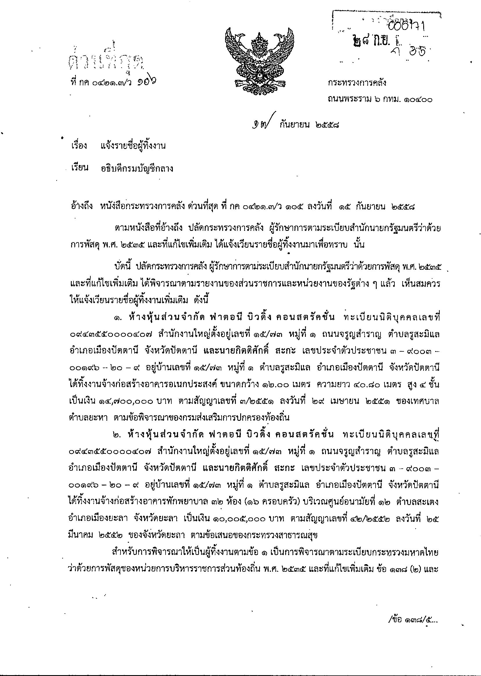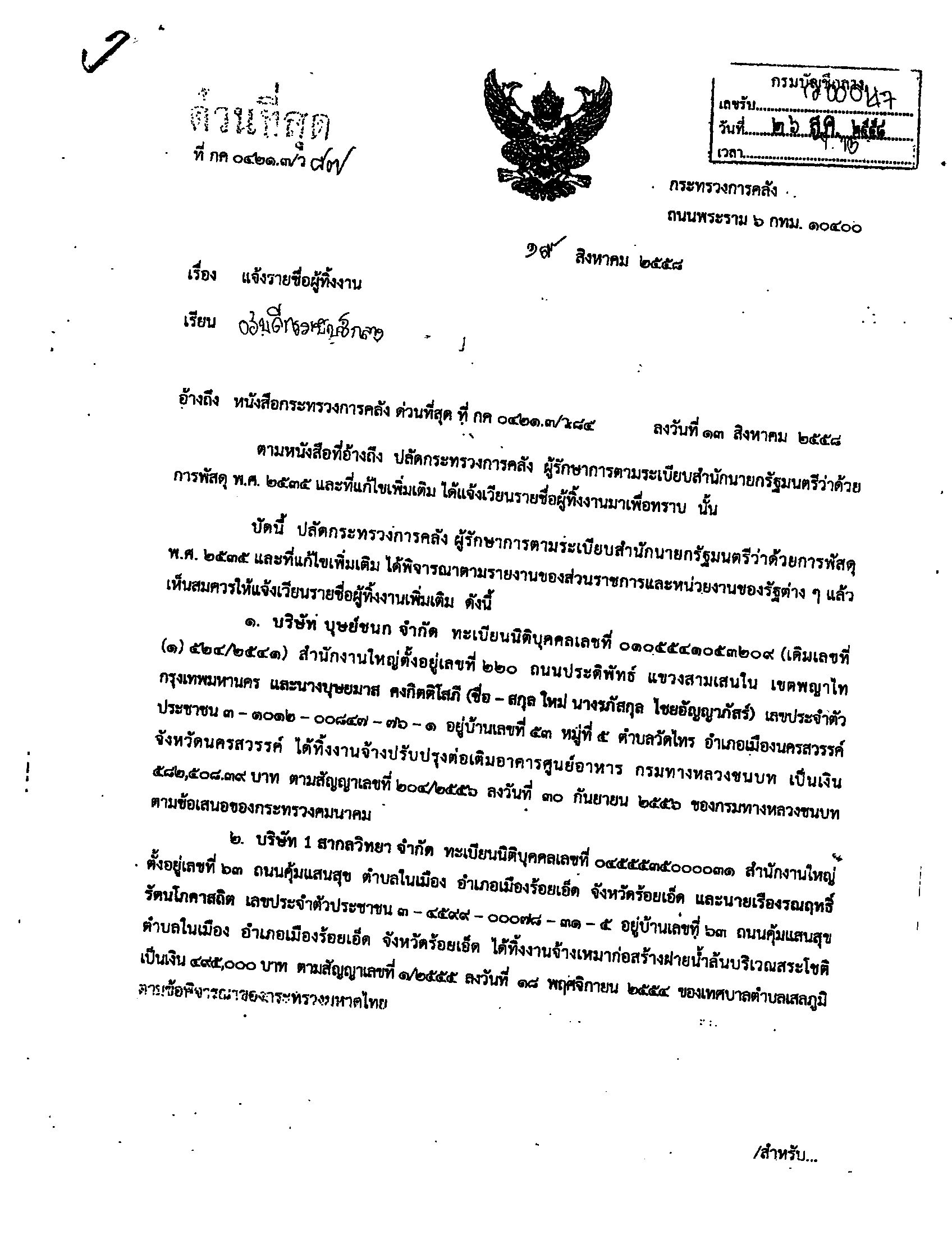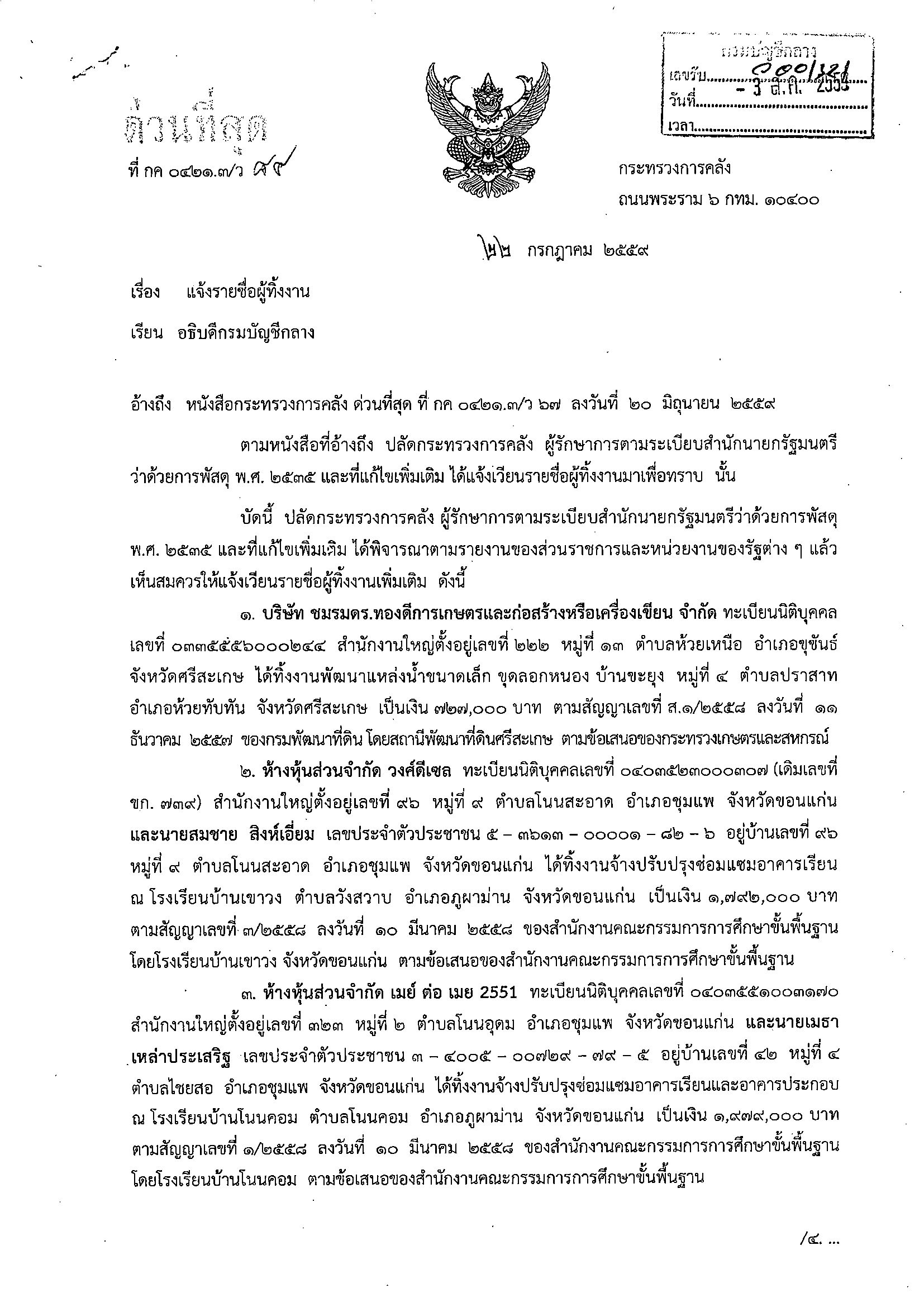หนังสือกระทรวงการคลัง ด่วนที่สุด ที่ กค (กวพ) 0421.3/ว 62 ลงวันที่ 23 กรกฎาคม 2557 เรื่อง แจ้งรายชื่อผู้ทิ้งงาน