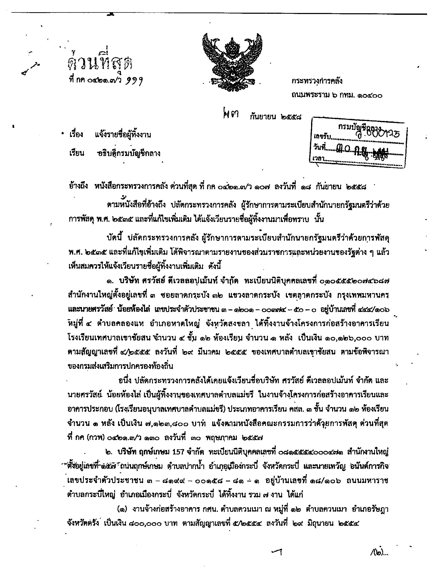 คำวินิจฉัยคณะกรรมการว่าด้วยการพัสดุ กรมบัญชีกลาง ด่วนที่สุด ที่ กค (กวพ) 0421.3/ว 343 ลงวันที่ 27 กันยายน 2556 เรื่อง แจ้งรายชื่อผู้ทิ้งงาน
