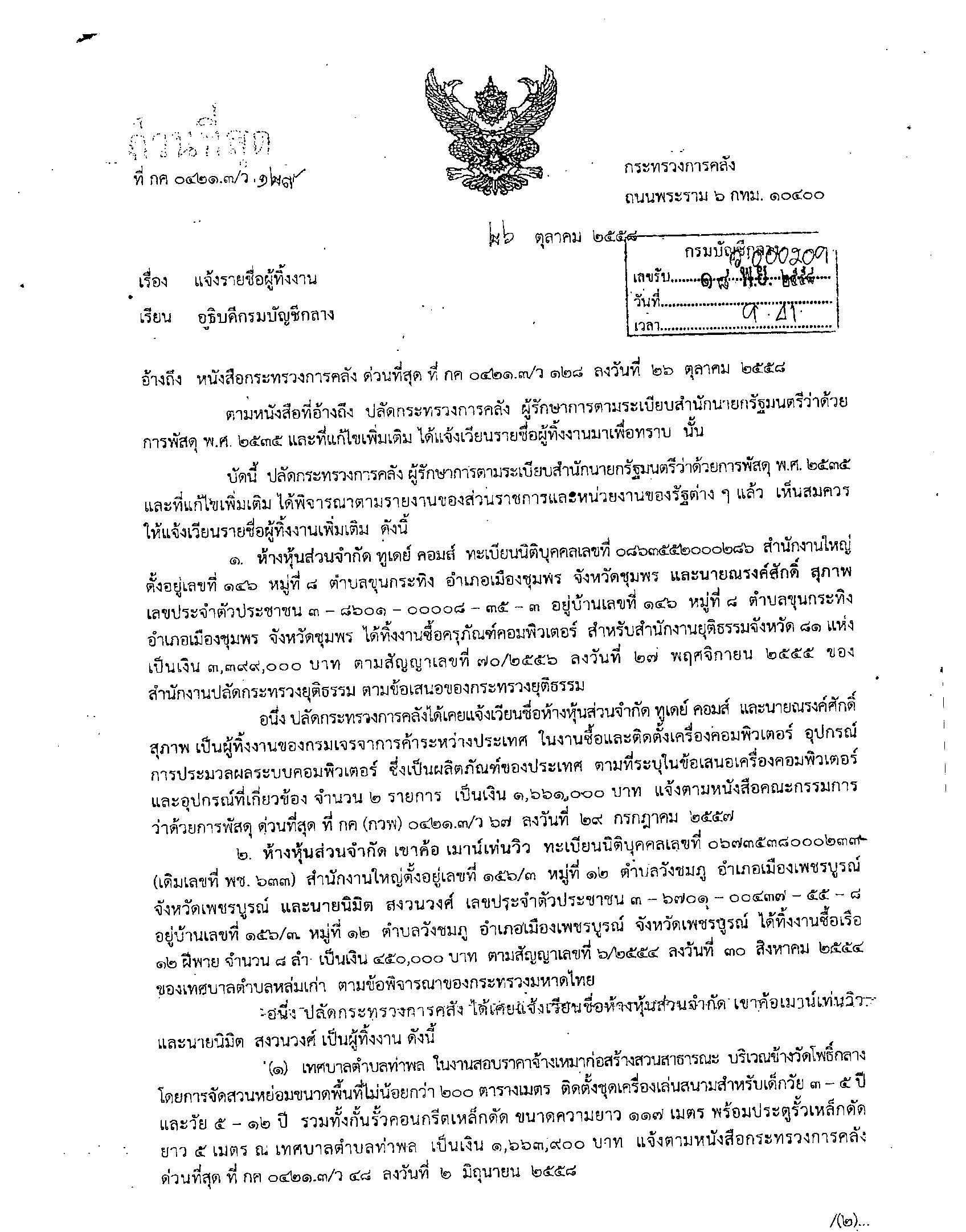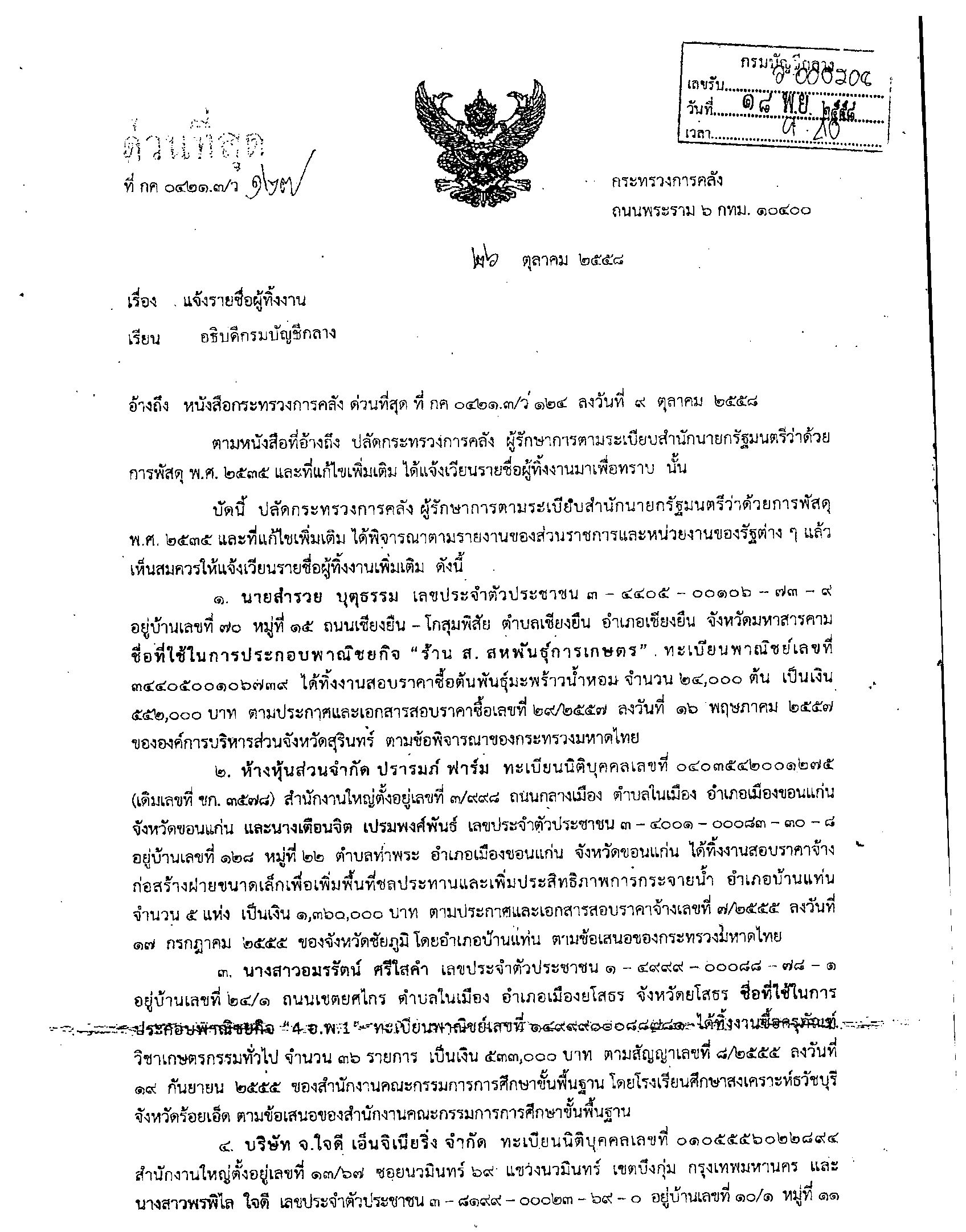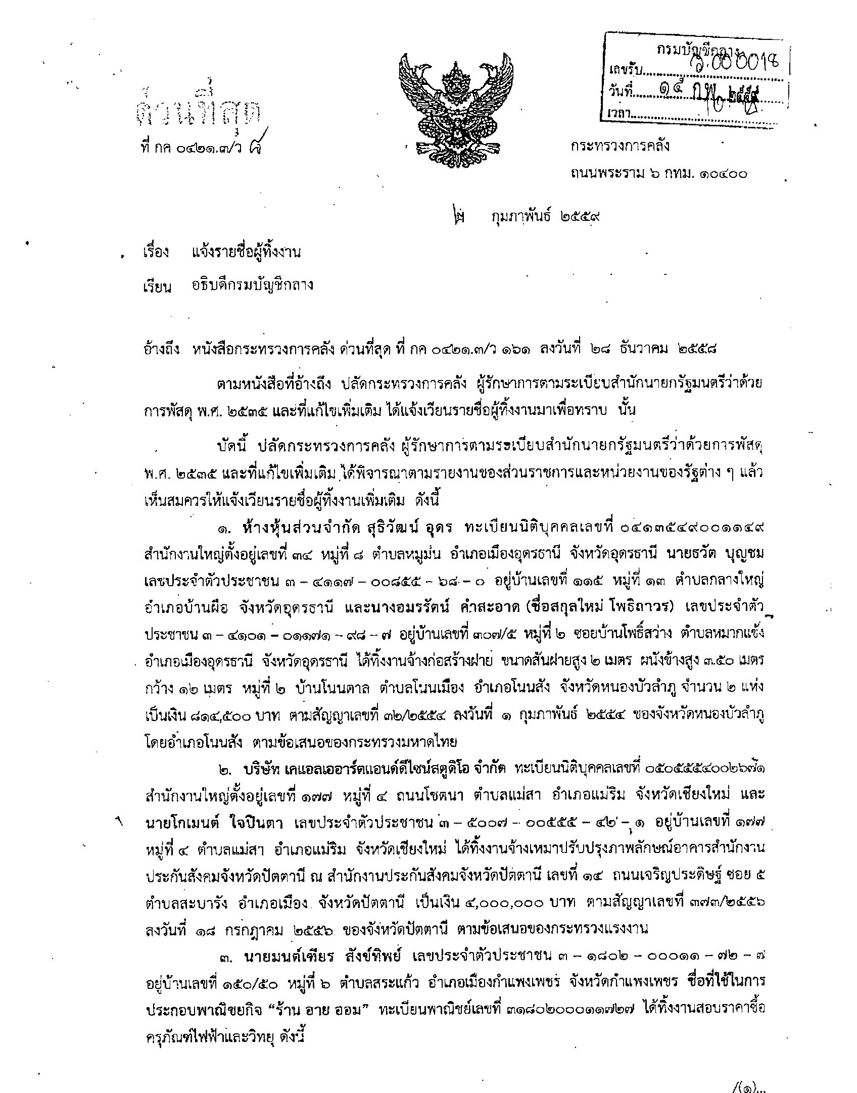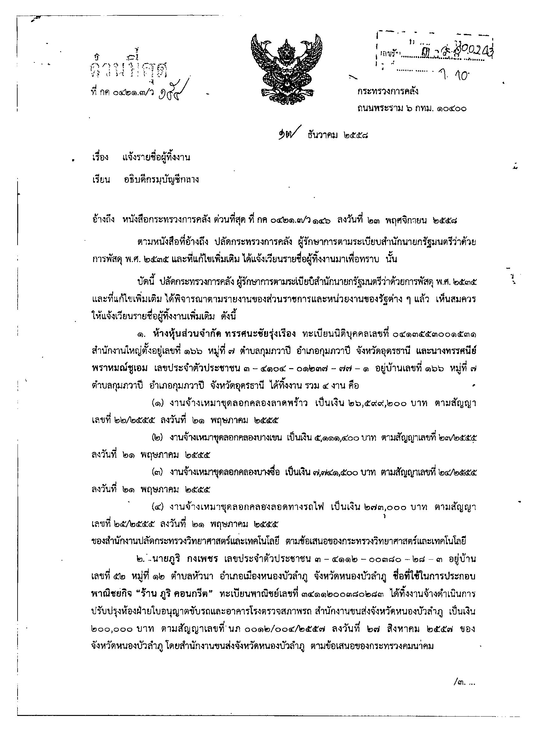 หนังสือกระทรวงการคลัง ด่วนที่สุด ที่ กค (กวพ) 0421.3/ว 121 ลงวันที่ 2 ธันวาคม 2557 เรื่อง แจ้งรายชื่อผู้ทิ้งงาน