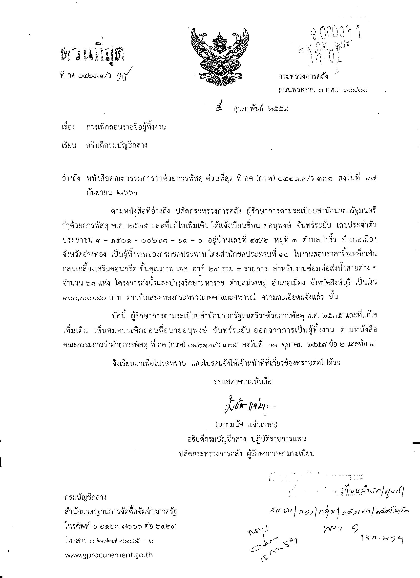 หนังสือกระทรวงการคลัง ด่วนที่สุด ที่ กค (กวพ) 0421.3/ว 20 ลงวันที่ 18 มีนาคม 2558 เรื่อง การเพิกถอนรายชื่อผู้ทิ้งงาน