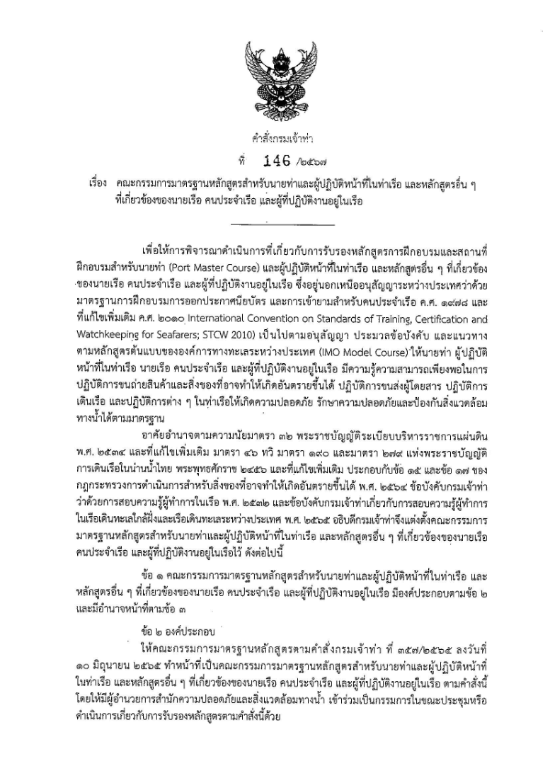 ประกาศกรมเจ้าท่า ที่ 177/2567 เรื่อง หลักเกณฑ์ วิธีการ และเงื่อนไขการรับรองสถานศึกษาฝึกอบรม รายละเอียดหลักสูตร การรับรองหลักสูตร และแบบประกาศนียบัตรอบรมหลักสูตรเรือบรรทุกคนโดยสารเดินภายในประเทศ