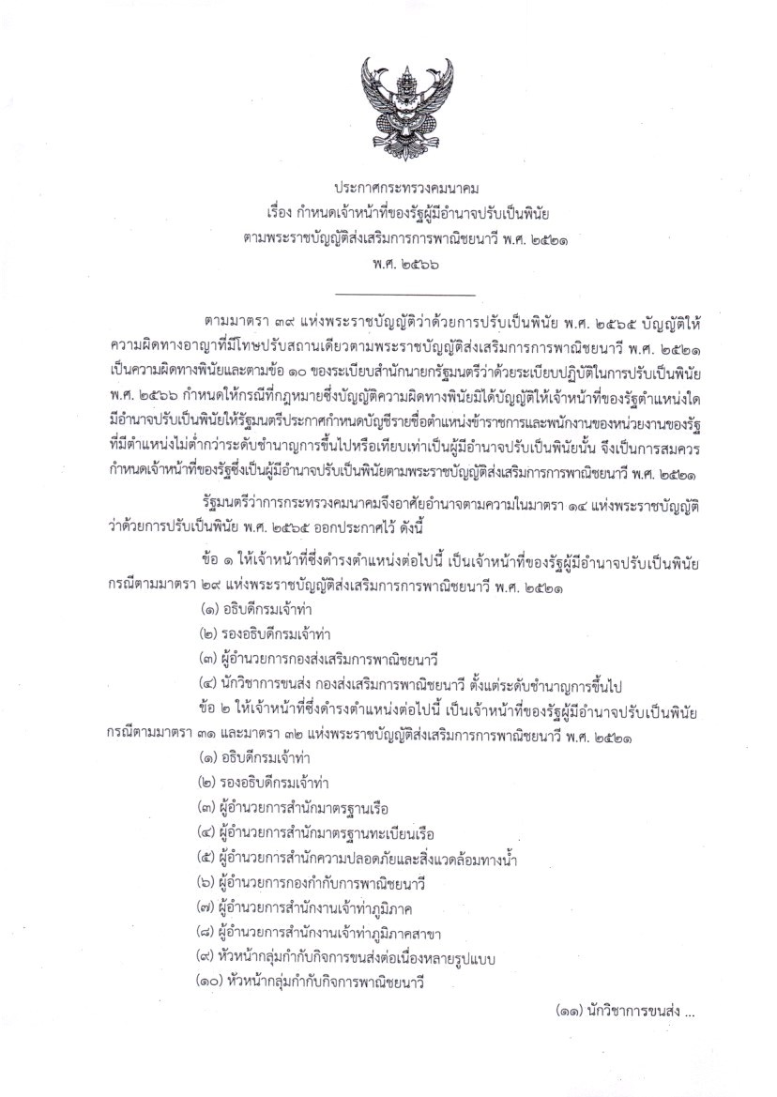 ประกาศกรมเจ้าท่า ที่ 102/2567 เรื่อง กำหนดองค์คณะเจ้าหน้าที่ของรัฐผู้มีอำนาจปรับเป็นพินัยตามพระราชบัญญัติเรือไทย พุทธศักราช 2481 และที่แก้ไขเพิ่มเติม