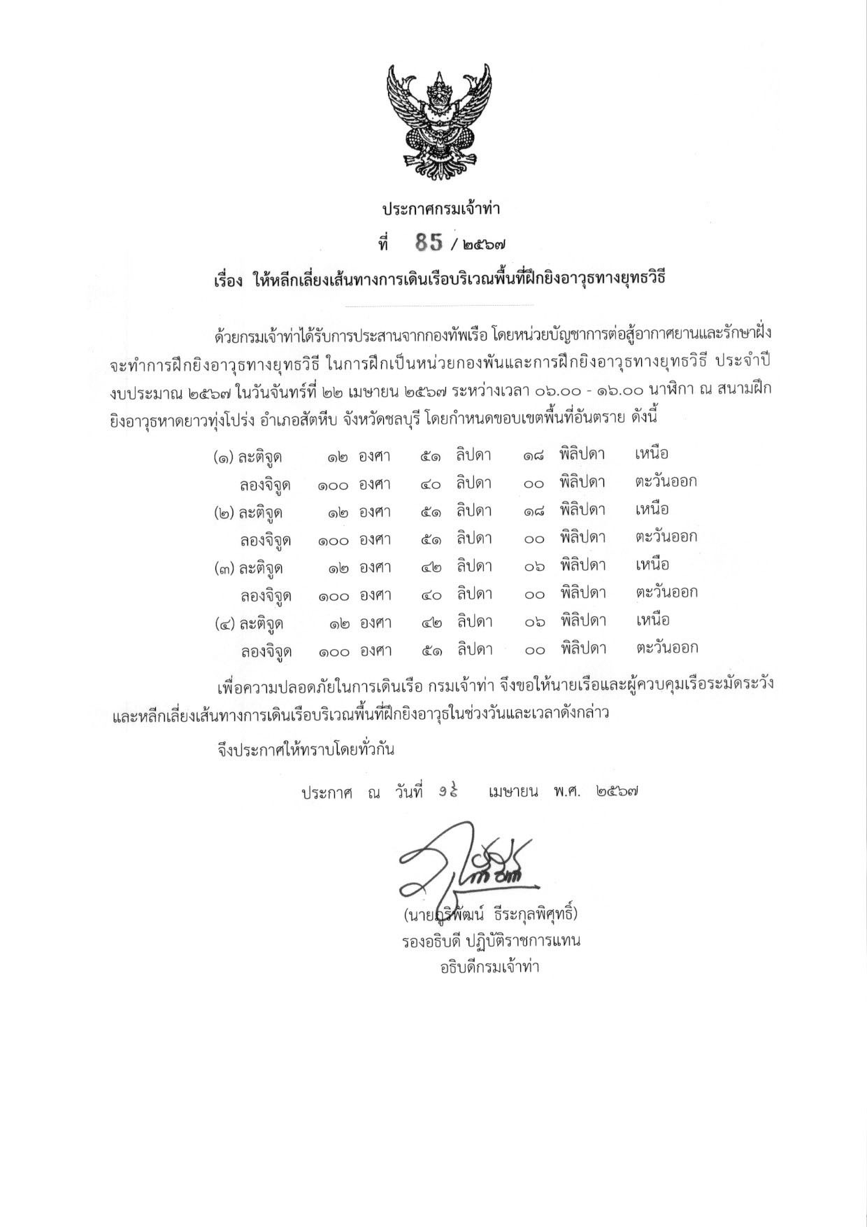 ประกาศกรมเจ้าท่าที่ 85/2567 เรื่อง ให้หลีกเลี่ยงเส้นทางการเดินเรือบริเวณพื้นที่ฝึกยิงอาวุธทางยุทธวิธี ที่มา : https://md.go.th/