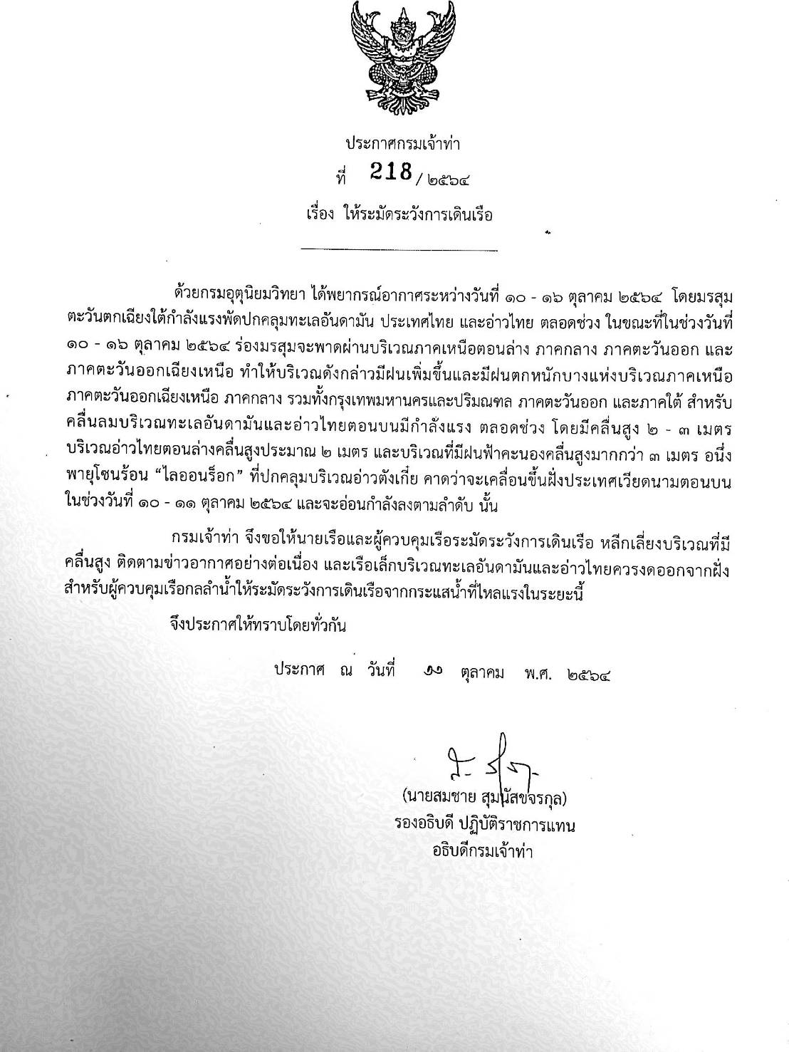 ประกาศกรมเจ้าท่า ที่ 218/2564 เรื่อง ให้ระมัดระวังการเดินเรือ ที่มา : https://md.go.th/