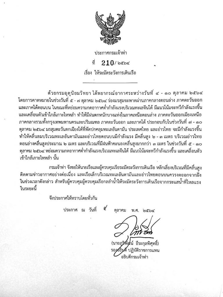 ประกาศกรมเจ้าท่า ที่ 210/2564 เรื่อง ระมัดระวังการเดินเรือที่มา : https://md.go.th/