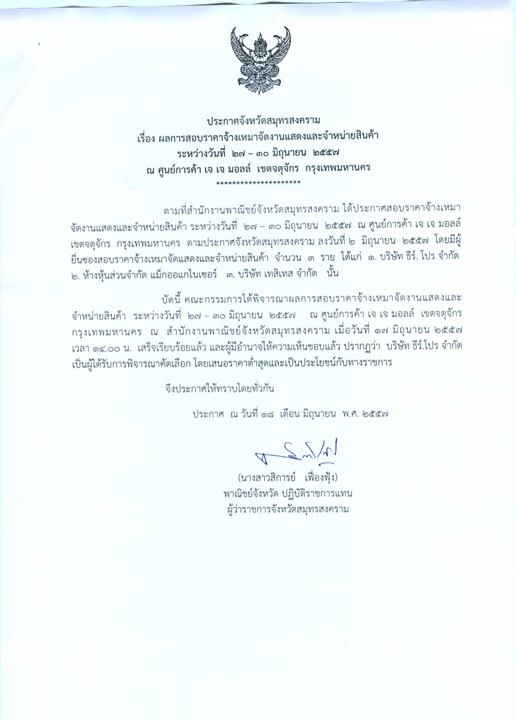 ประกาศจังหวัดสมุทรสงคราม เรื่องสอบราคาจ้างเหมาจัดงานแสดงและจำหน่ายสินค้า ณ ศูนย์การค้า เจ.เจ มอลล์ เขตจตุจักร กทม.
