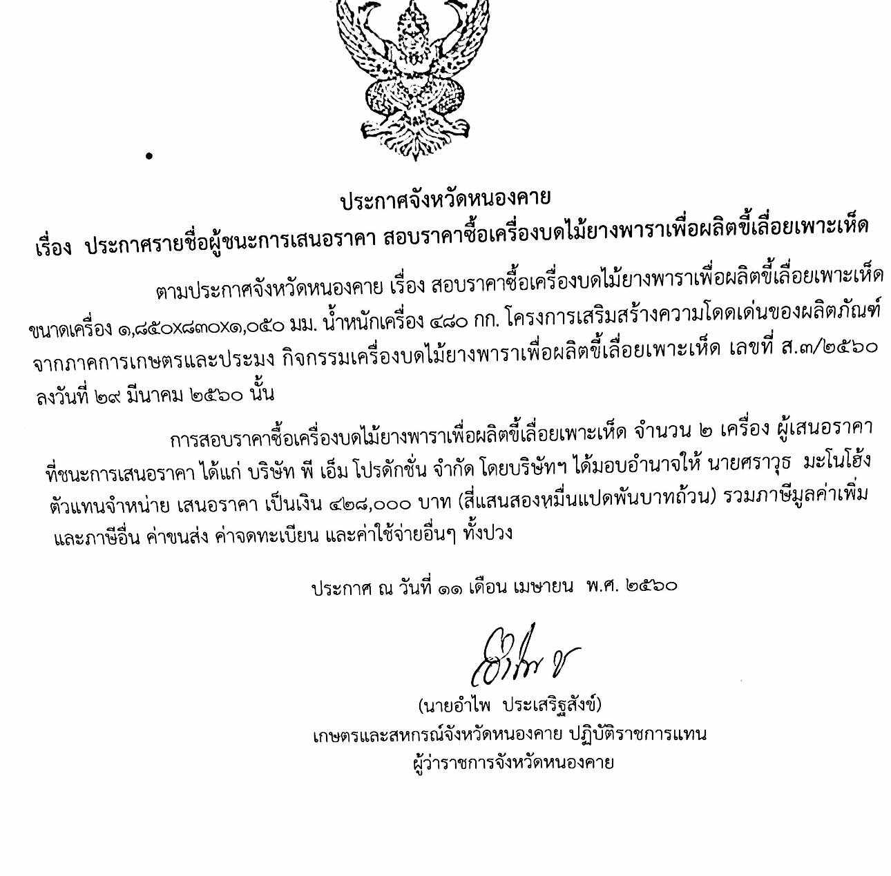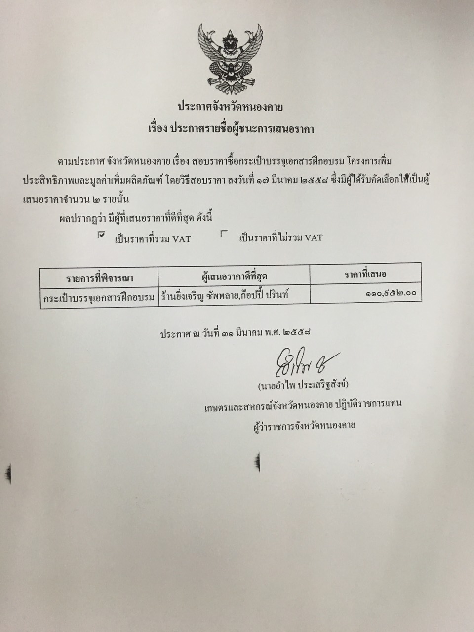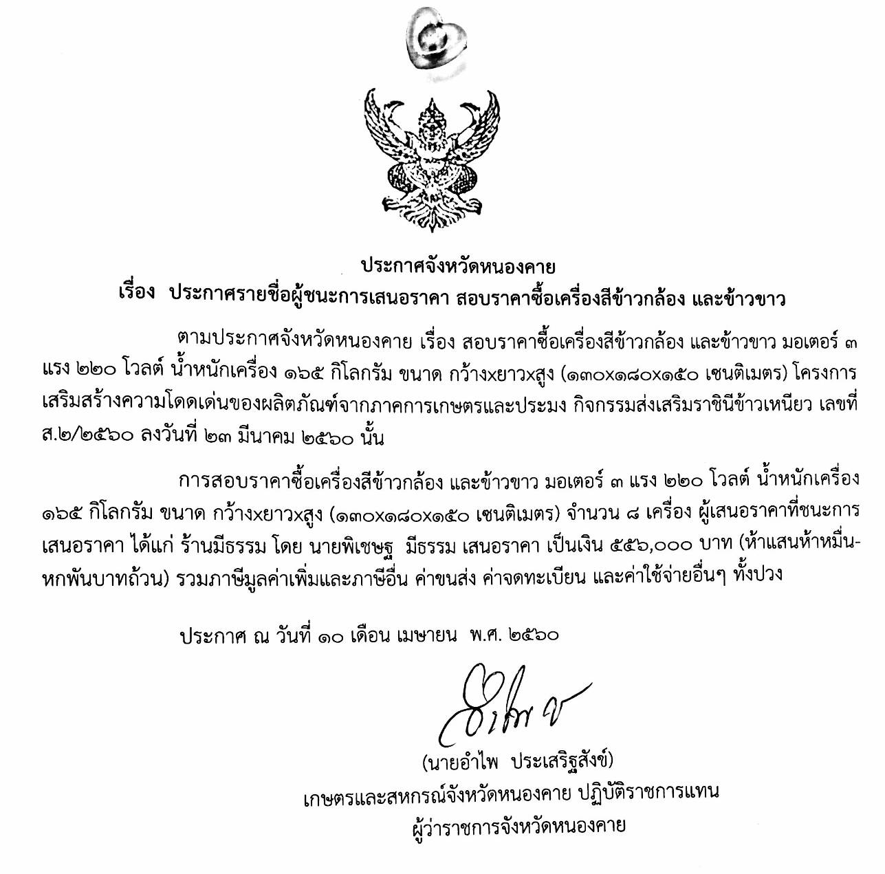 ประกาศจังหวัดหนองคาย เรื่อง ประกาศผู้ชนะการเสนอราคาประกวดราคาซื้อโครงการส่งเสริมและพัฒนาการเกษตรยั่งยืน โดยยึดหลักปรัชญาเศรษฐกิจพอเพียง
