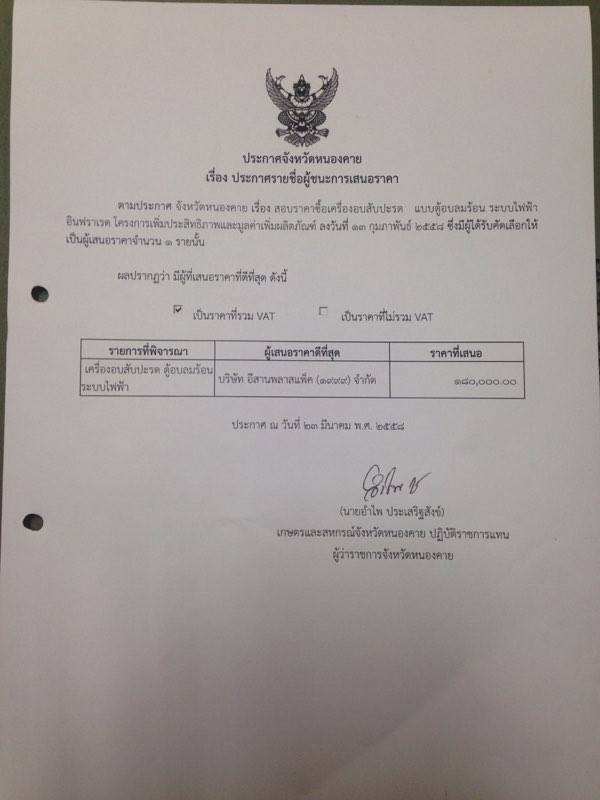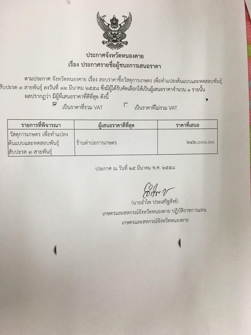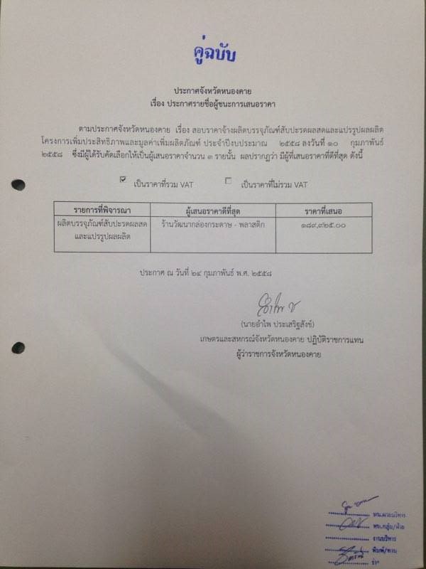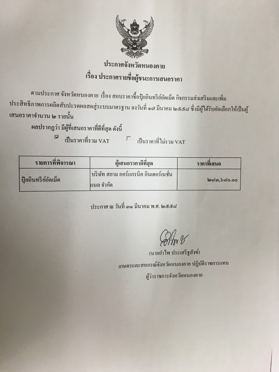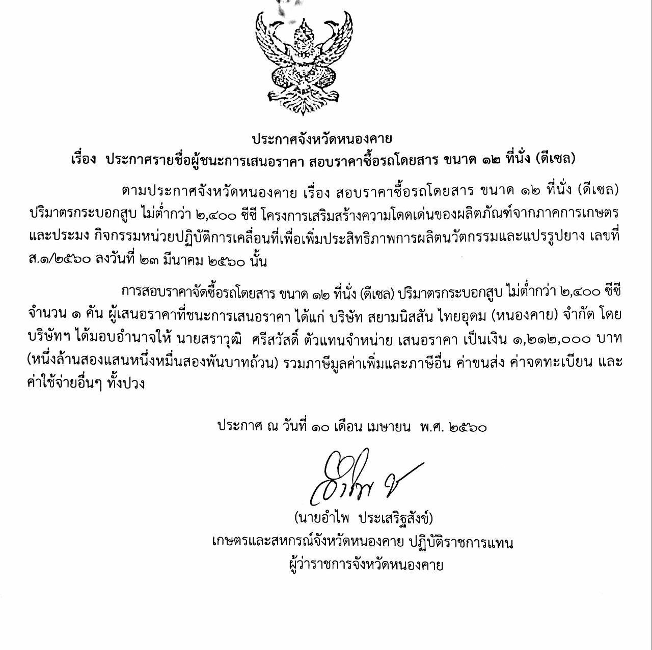ประกาศจังหวัดหนองคาย เรื่อง ประกาศผู้ชนะการเสนอราคาประกวดราคาซื้อโครงการส่งเสริมและพัฒนาการเกษตรยั่งยืน โดยยึดหลักปรัชญาเศรษฐกิจพอเพียง