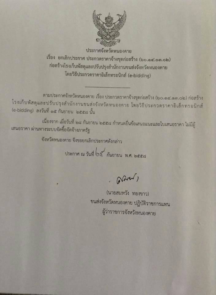 ประกวดราคาจ้างชุดก่อสร้างโรงเก็บพัสดุ ซ่อมผิวจราจร และปรับปรุงสำนักงานขนส่งจังหวัดหนองคาย (05/10/2558)