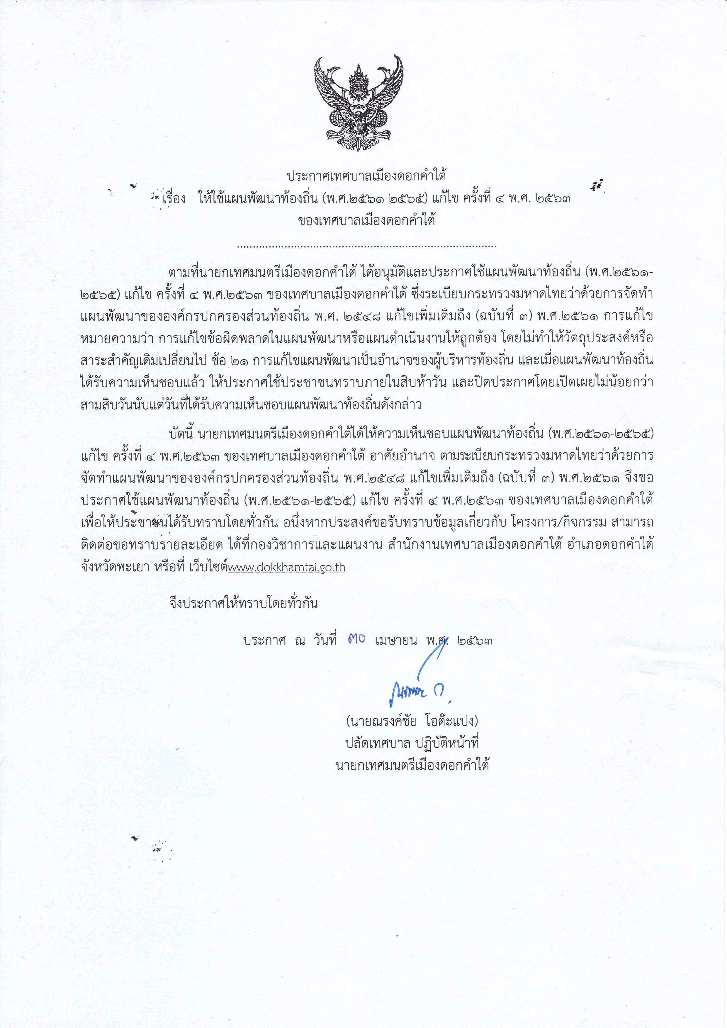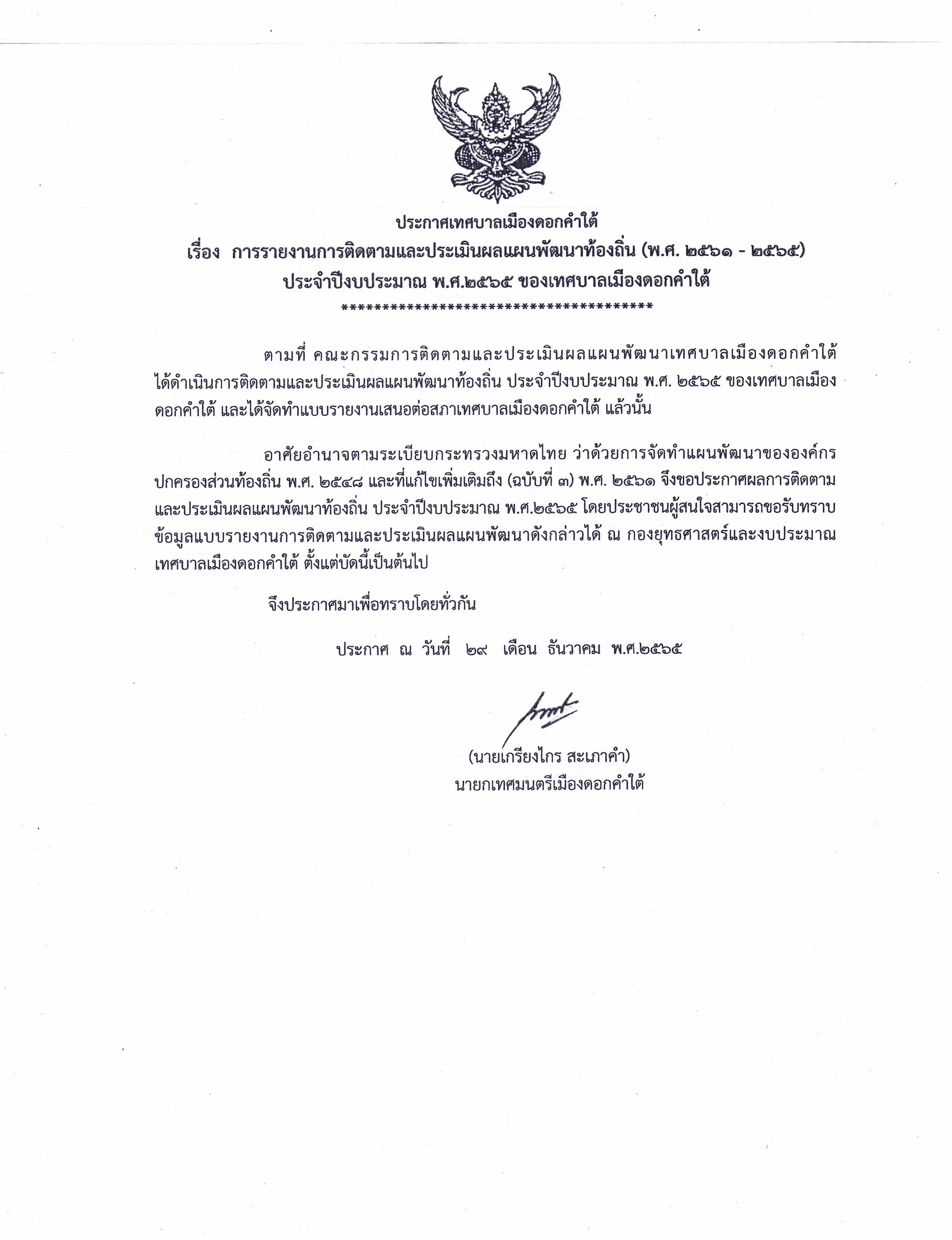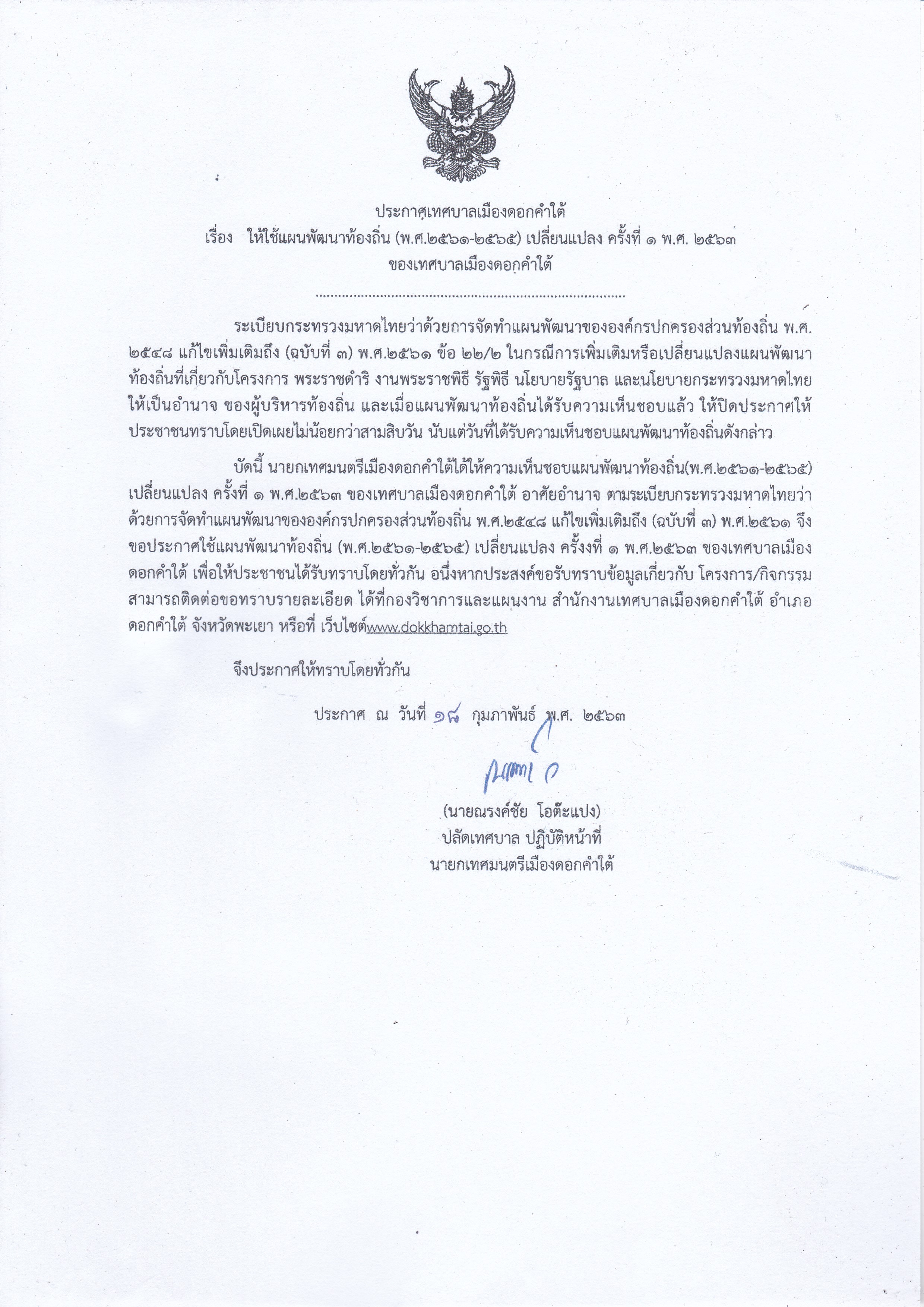 137 | ประกาศเทศบาลเมืองดอกคำใต้ เรื่อง ประกาศผู้ชนะการเสนอราคา ประกวดราค้าจ้างก่อสร้างโครงการปรับปรุงถนน คสล.สว่างอารมณ์ ซอย 2 หมู่ที่ 5 ชุมชนบ้านสว่างอารมณ์ ตำบลสว่างอารมณ์ อำเภอดอกคำใต้ จังหวัดพะเยา ด้วยวิธีประกวดราคาอิเล็กทรอนิกส์ (e-bidding) | คลัง |