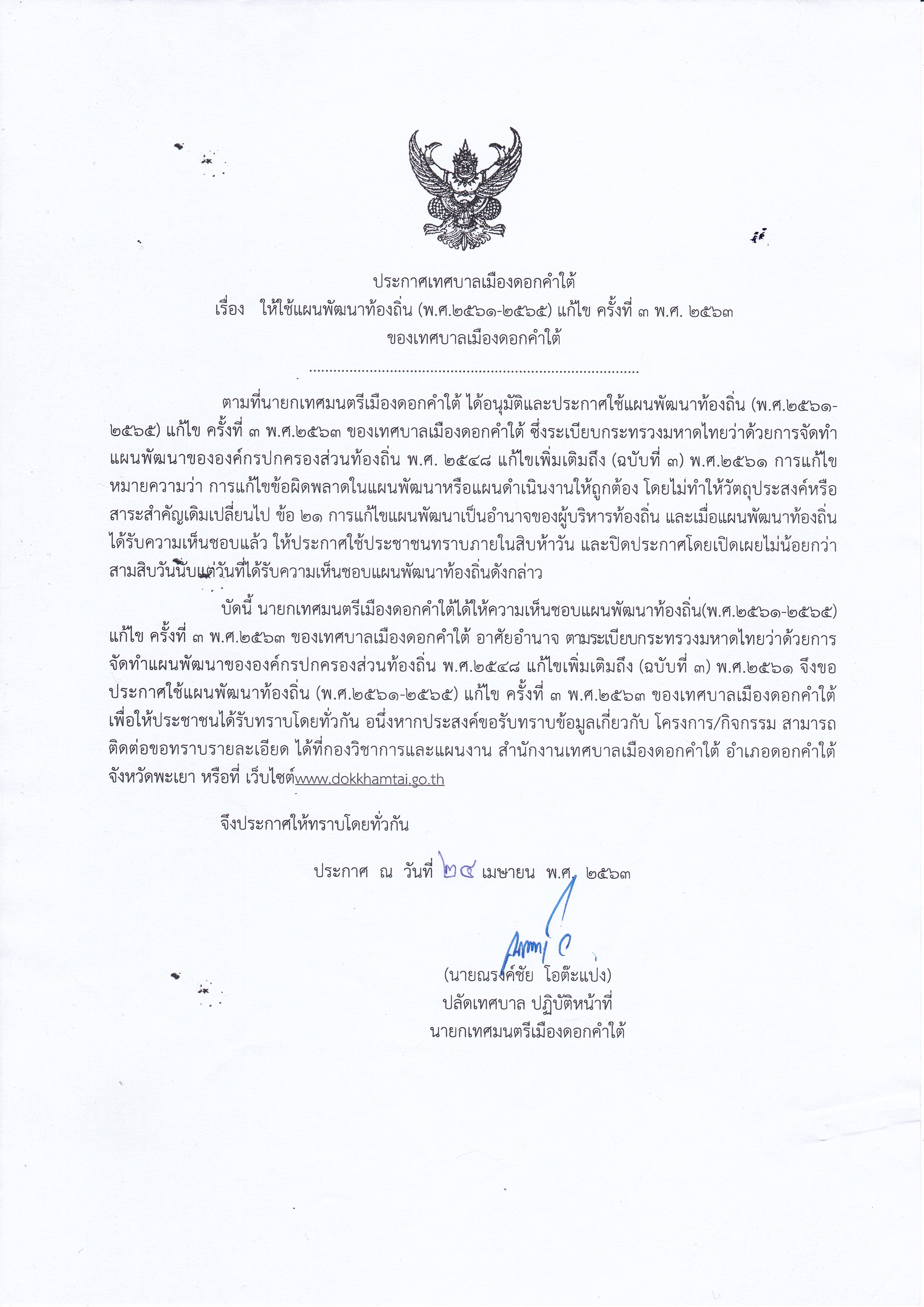 153 | ประกาศเทศบาลเมืองดอกคำใต้ เรื่อง ประกาศผู้ชนะการเสนอราคา โครงการปรับปรุงถนนผิวทางเเอสฟัลท์ติกคอนกรีต รหัสทางหลวงท้องถิ่น พย.ถ. 2-0043 สายปุญญาลังกา หมู่ที่ 7 ชุมชนบ้านนาหลิม ตำบลดอนศรีชุม อำเภอดอกคำใต้ จังหวัดพะเยา | คลัง |