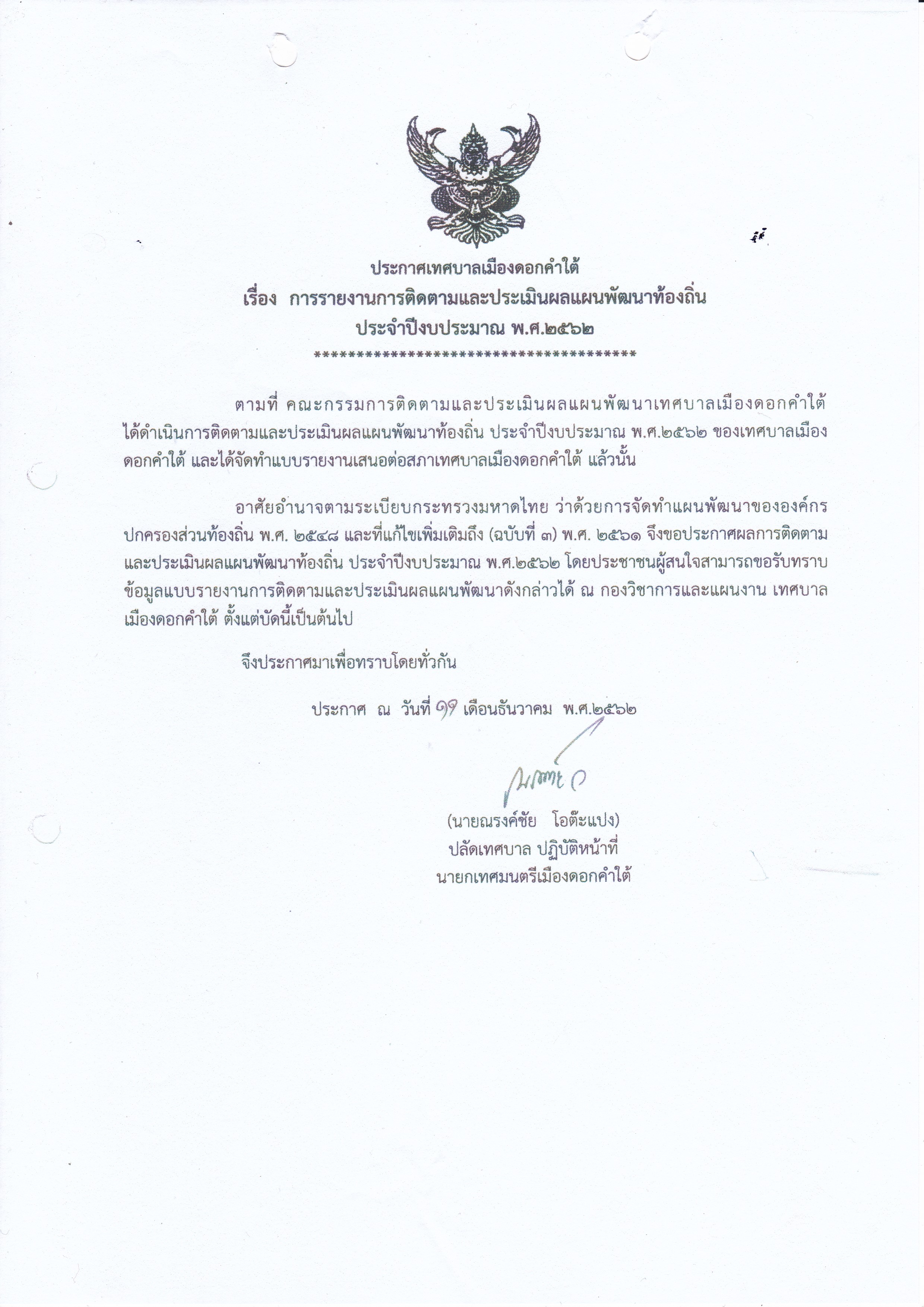 118 | ประกาศเทศบาลเมืองดอกคำใต้ เรื่อง ประกวดราคาจ้างจ้างเหมาฝังกลบขยะในเขตเทศบาลเมืองดอกคำใต้ อำเภอดอกคำใต้ จังหวัดพะเยา ด้วยวิธีประกวดราคาอิเล็กทรอนิกส์ (e-bidding) | คลัง |