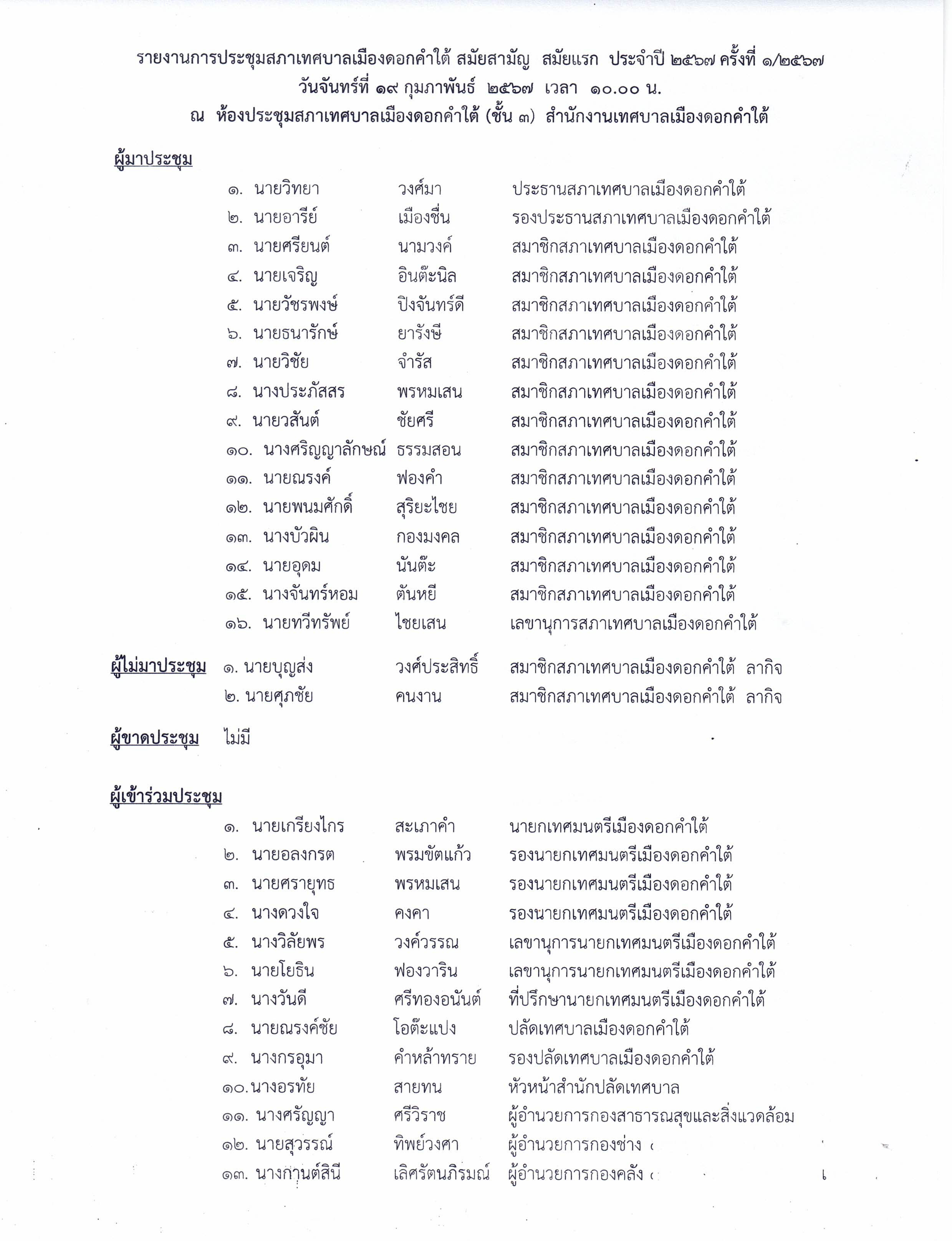45 | รายงานการประชุมสภาเทศบาลเมืองดอกคำใต้ สมัยสามัญ สมัยเเรก ประจำปี 2567 ครั้งที่ 1/2567 | สำนักปลัด |