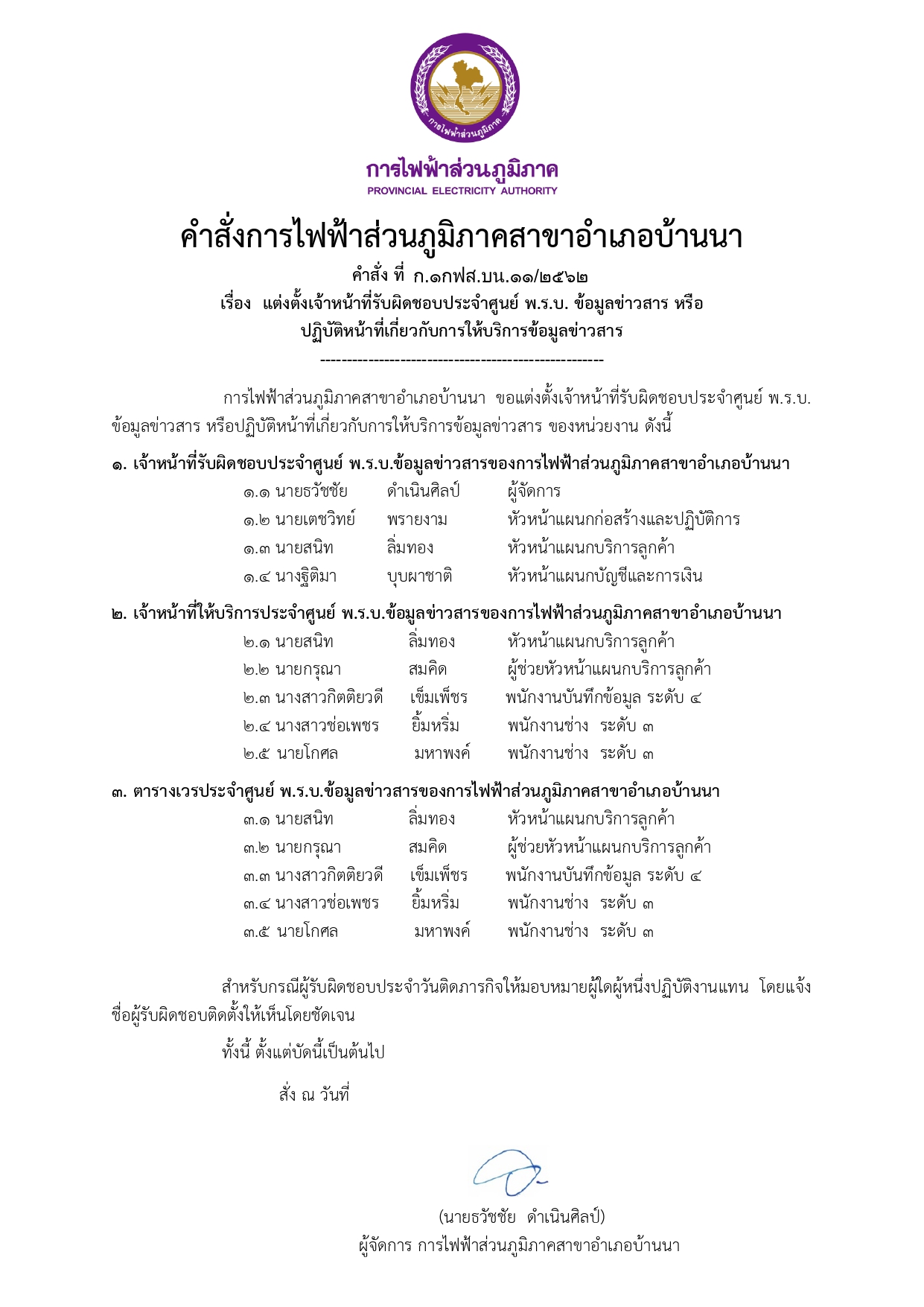 ประกาศการไฟฟ้าส่วนภูมิภาค เรื่องประกาศรายชื่อผู้ผ่านการสอบคัดเลือก และบัญชีสำรอง สังกัดการไฟฟ้าส่วนภูมิภาคเขต 1 ภาคกลาง