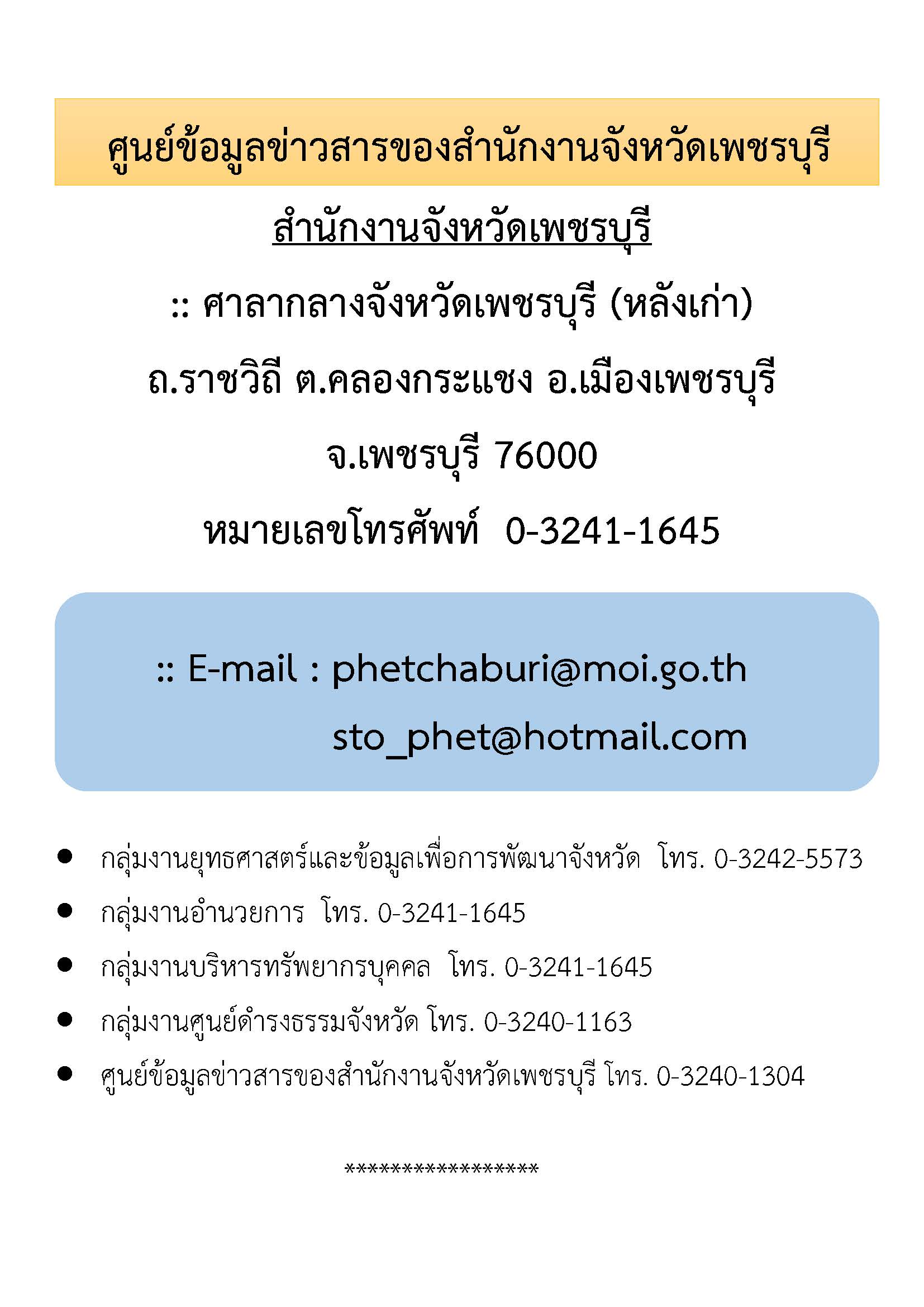 | 4 | สถานที่ติดต่อของสำนักงานจังหวัดเพชรบุรี | สำนักงานจังหวัดเพชรบุรี | |