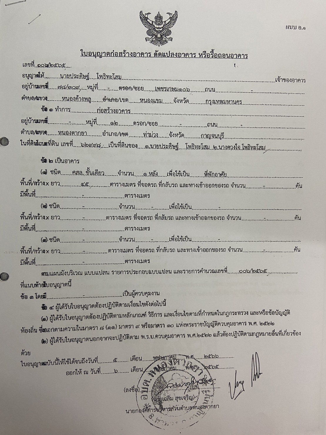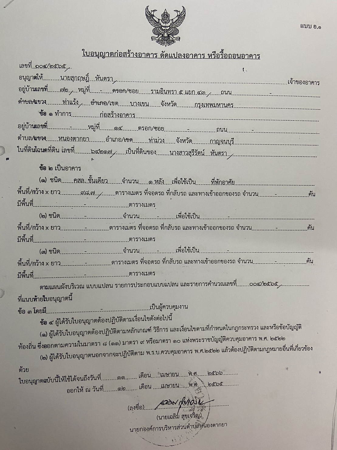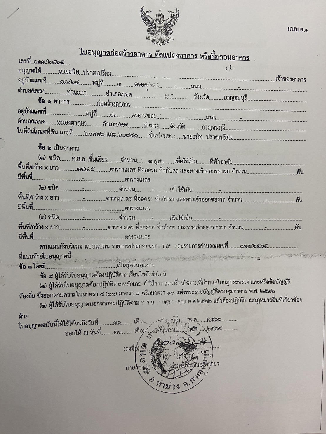ผลการอนุญาตปลูกสร้างบ้านพักอาศัย ของนายจักรกฤษณ์ กิตติภักดีกุล
