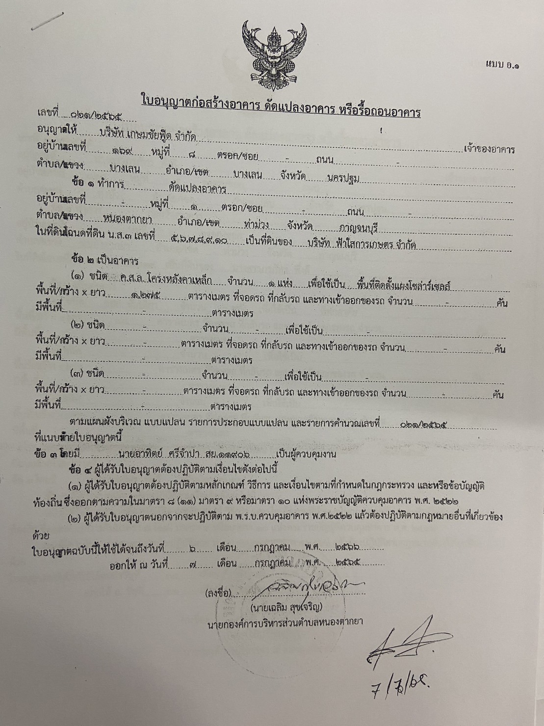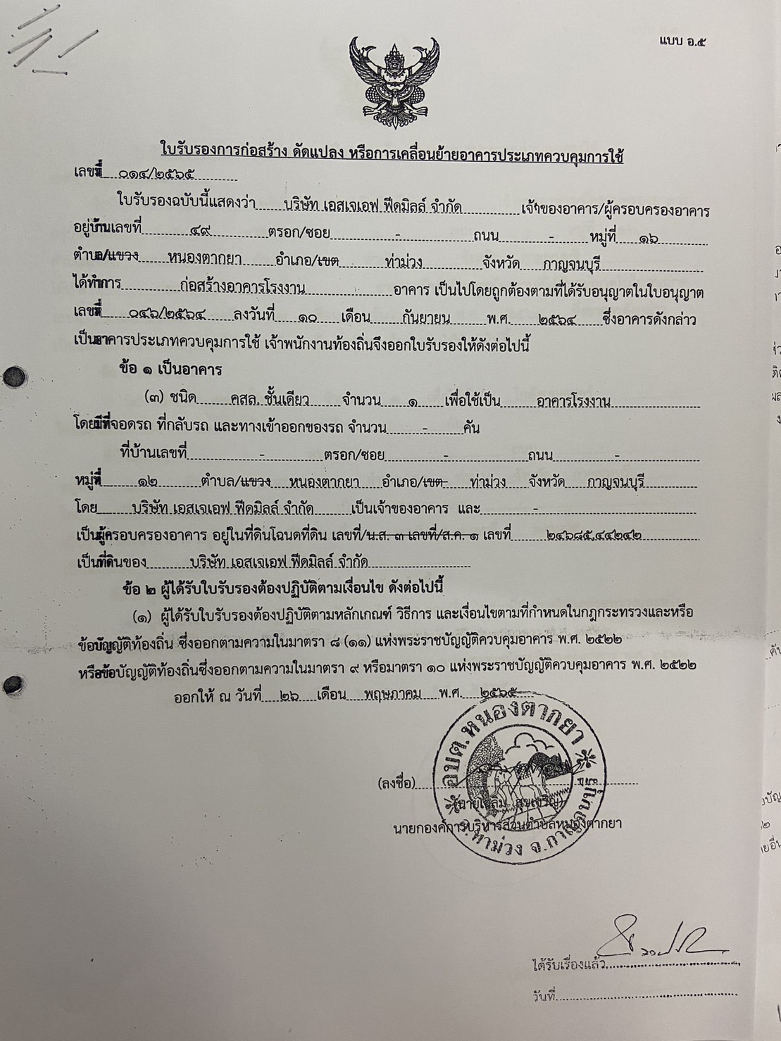 ผลการอนุญาตปลูกสร้างอาคารของ บริษัท เอสเจเอฟ ฟีดมิลล์ จำกัด