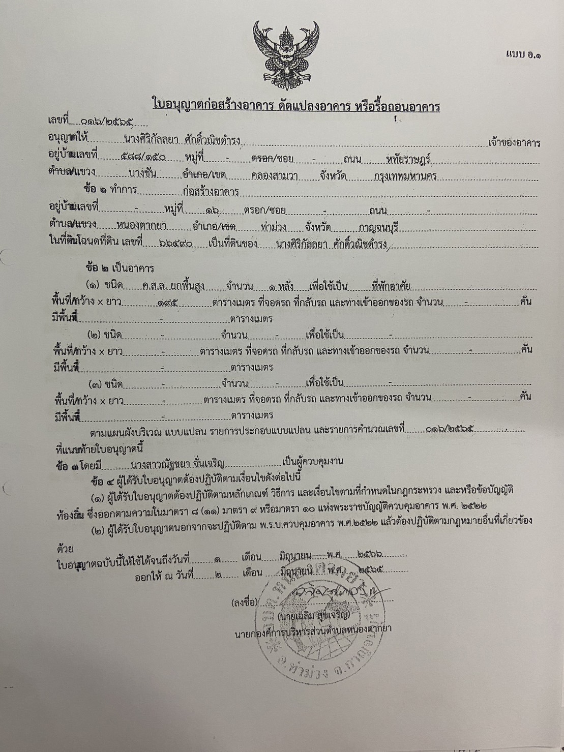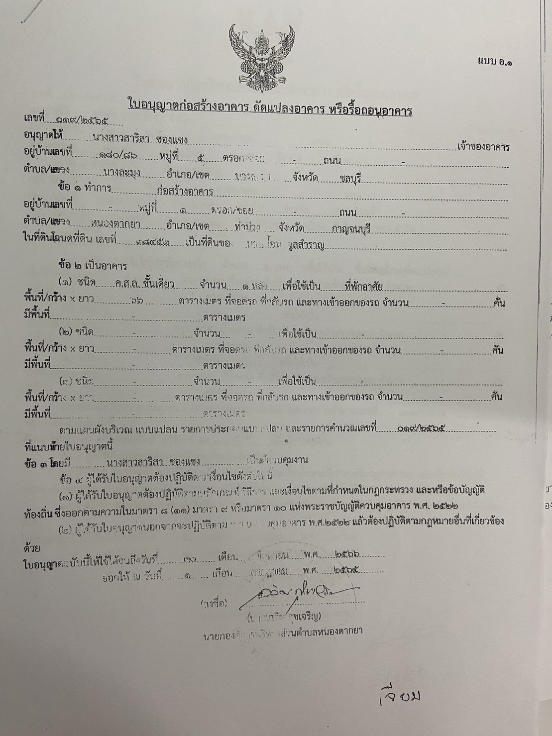 ผลการอนุญาตปลูกสร้างบ้านพักอาศัย ของนางศิริกัลลยา ศักดิ์วณิชดำรง