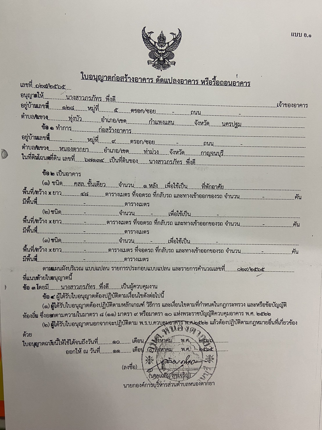 ผลการอนุญาตปลูกสร้างบ้านพักอาศัย ของนางสาวภรภัทร พึ่งดี