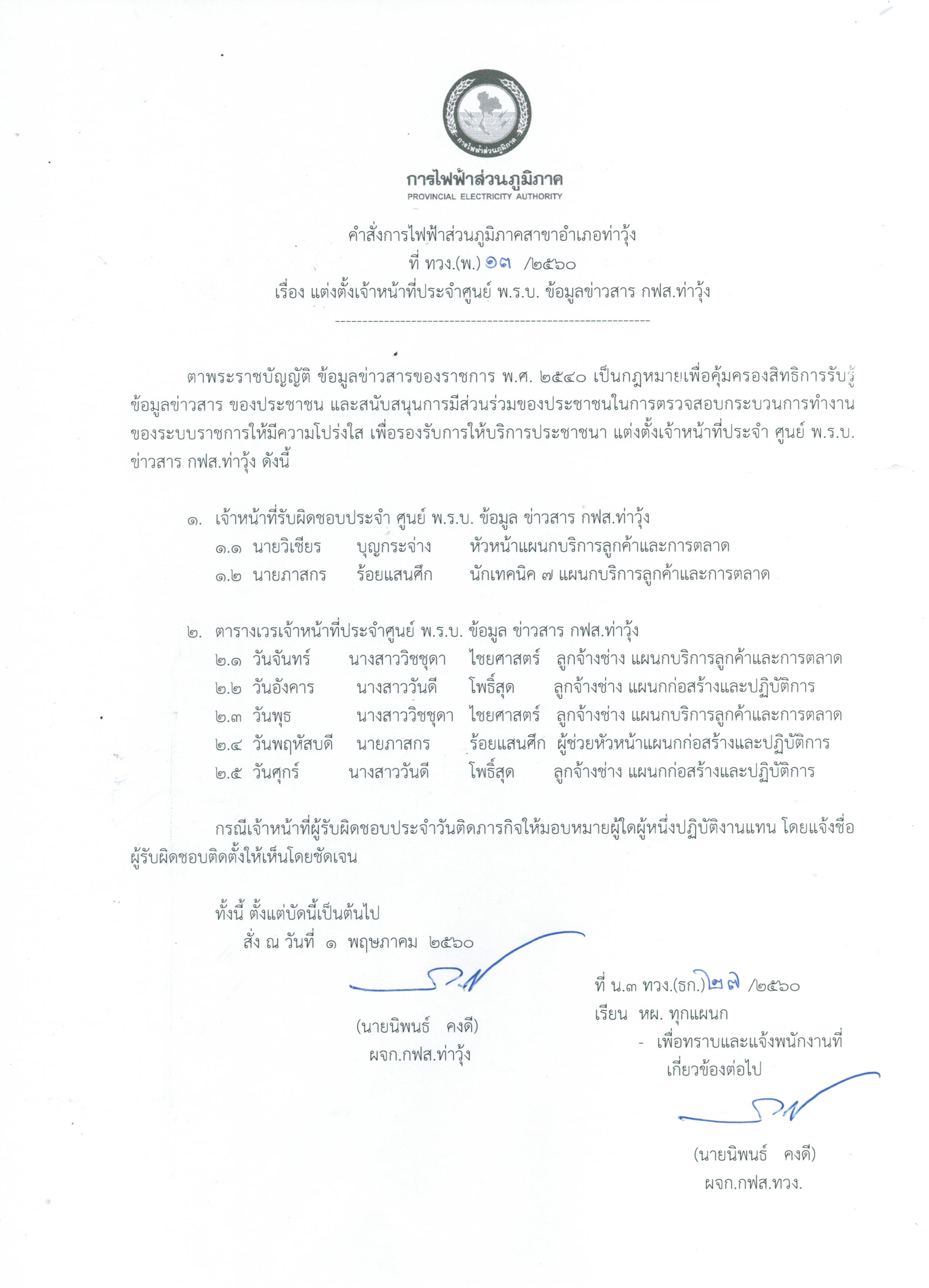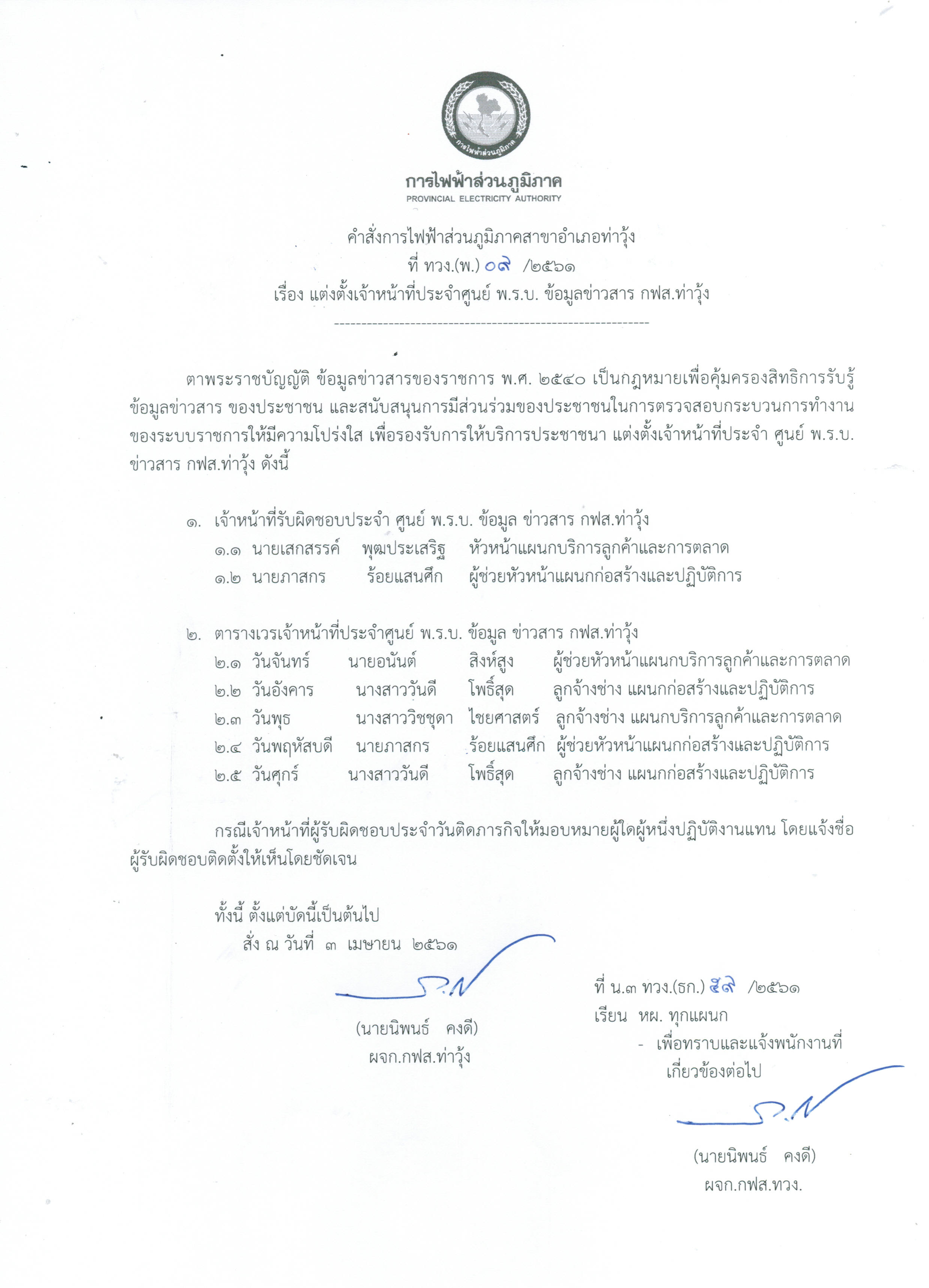 สัญญาจ้างเหมางานปรับปรุงระบบจำหน่าย ม.1 ต.ท้ายตลาด อ.ท่าวุ้ง จ.ลพบุรี (น.3จ.ทวง.(กป.) 15/2561)