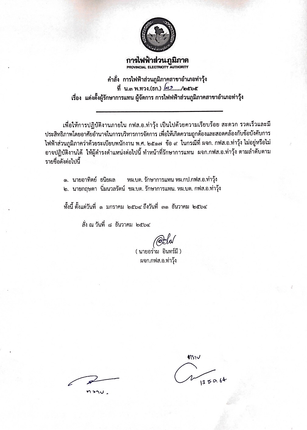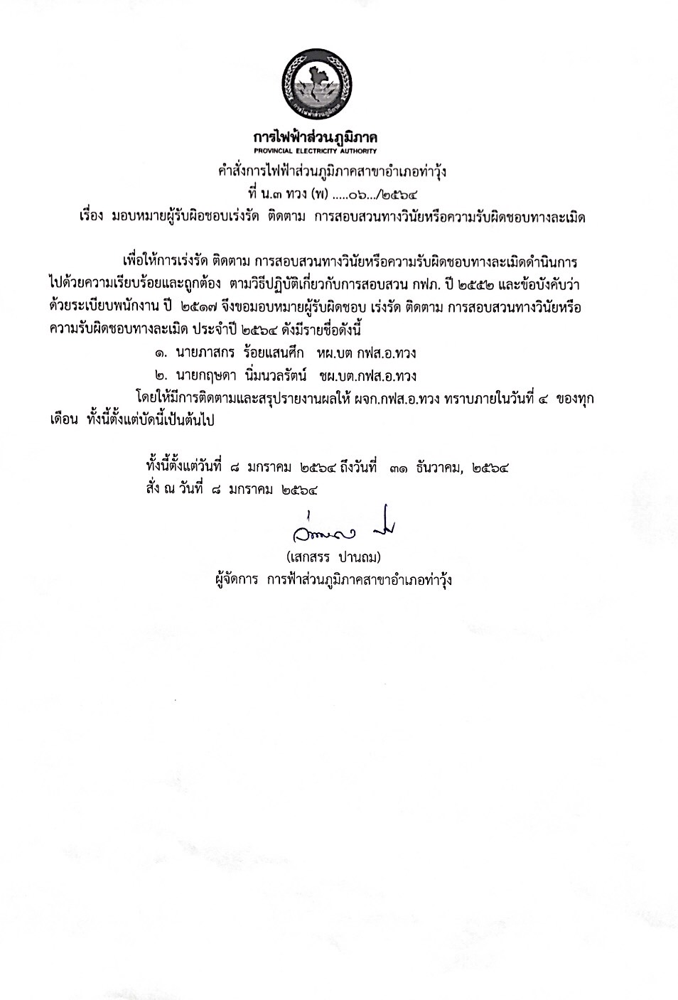งานปรับปรุงระบบจำหน่ายเปลี่ยนสาย(สภ.ท่าวุ้ง) ต.ท่าวุ้ง อ.ท่าวุ้ง จ.ลพบุรี น.3จ.ทวง.(กป.)12/2564 ลว. 29 มิ.ย. 64
