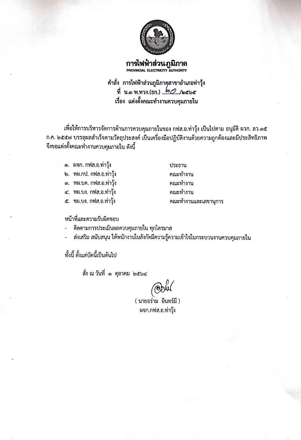 สัญญาจ้างเหมางานเชิงป้องกันระบบไฟฟ้าและระบบควบคุม พื้นที่ กฟส.อ.ท่าวุ้ง ( น.3จ.ทวง.(กป.)16/2564 ลว. 19 ส.ค. 2564)