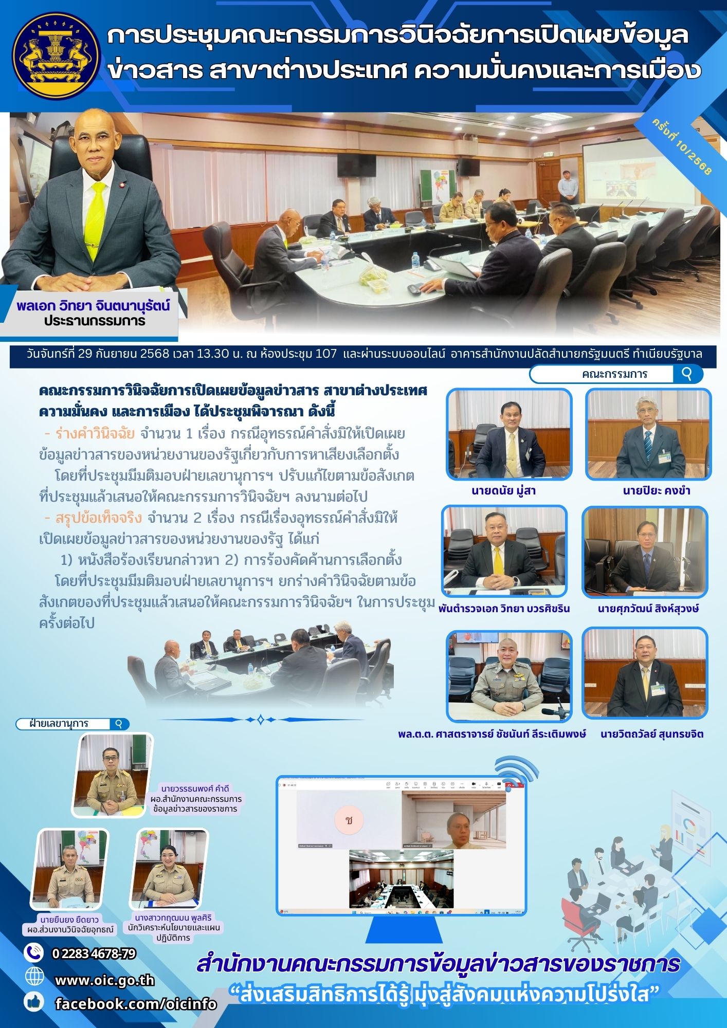 การประชุมคณะกรรมการวินิจฉัยการเปิดเผยข้อมูลข่าวสาร สาขาต่างประเทศความมั่นคง และการเมือง ครั้งที่ ๑๐/๒๕๖๘ วันจันทร์ที่ ๒๙ กันยายน ๒๕๖๘ เวลา ๑๓.๓๐ น. ณ ห้องประชุม ๑๐๗ ชั้น ๑ อาคาร สปน