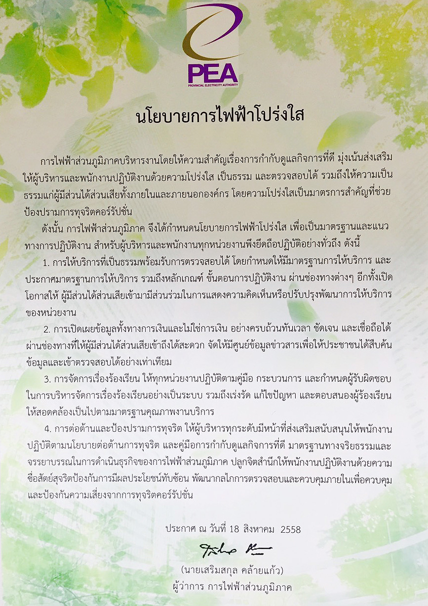 นโยบายการไฟฟ้าส่วนภูมิภาค โปร่งใสอย่างยั่งยืน