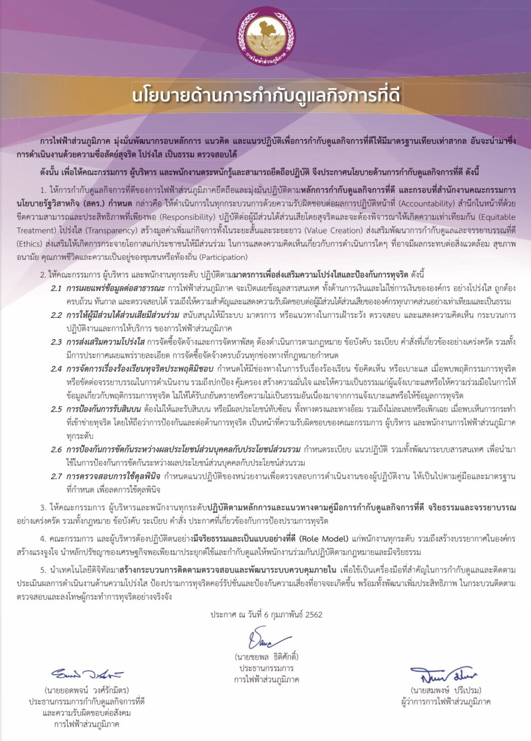 นโยบายการกำกับดูแลกิจการที่ดี ลงวันที่ 6 กุมภาพันธ์ 2562