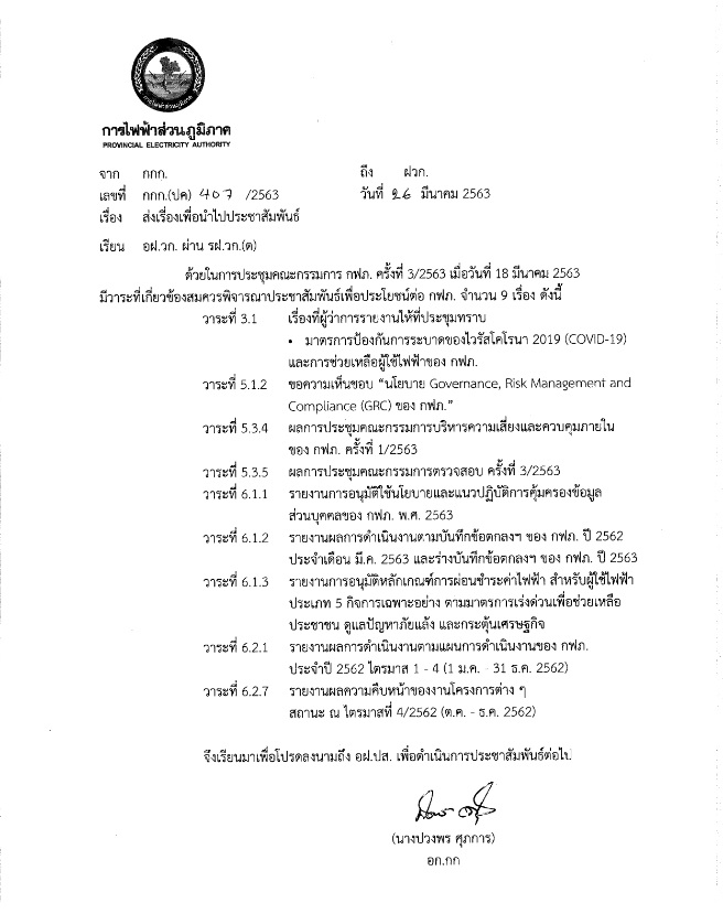 การดำเนินงาน “การไฟฟ้าส่วนภูมิภาคโปร่งใสอย่างยั่งยืน” ปี 2563