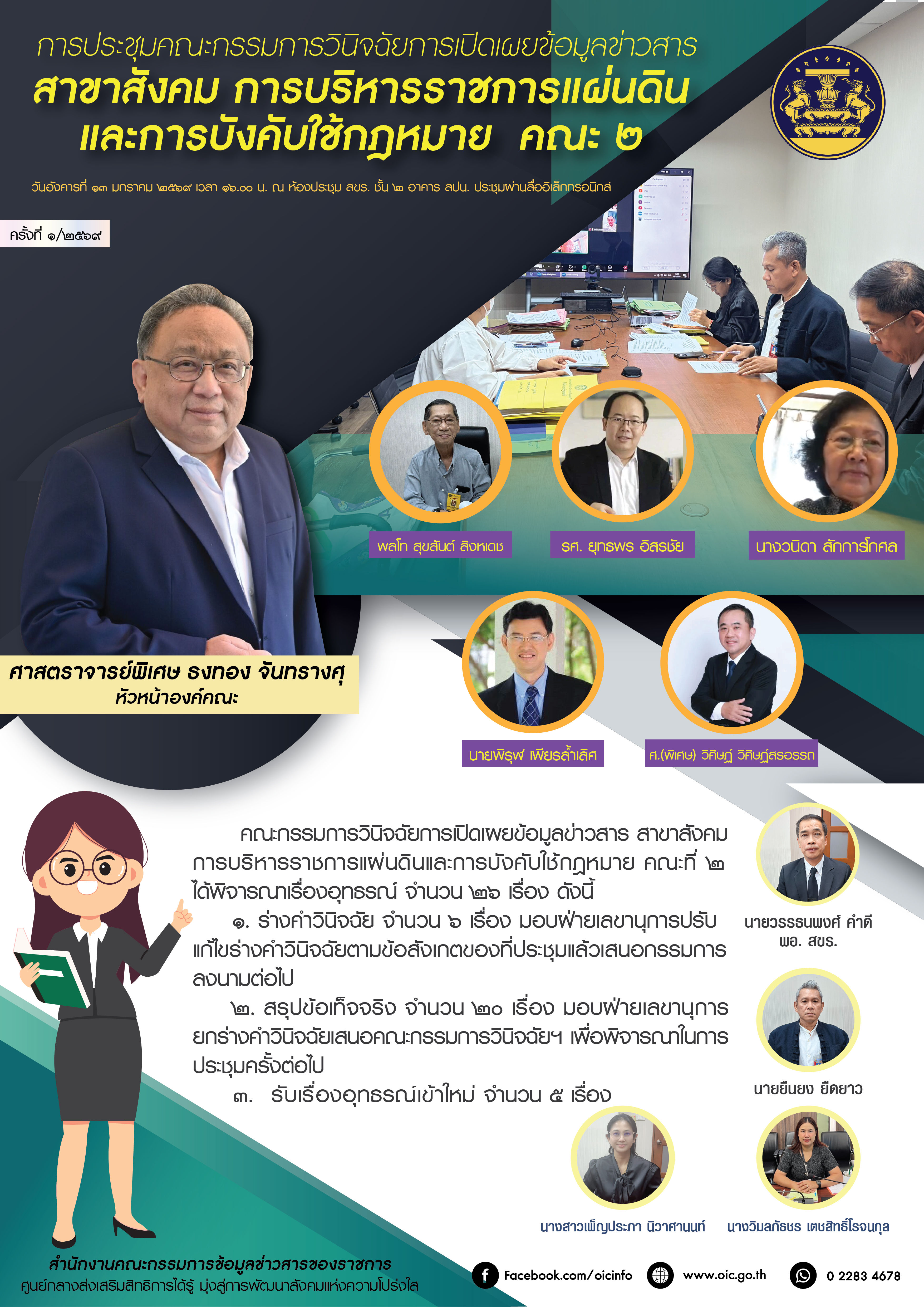 การประชุมคณะกรรมการวินิจฉัยการเปิดเผยข้อมูลข่าวสาร สาขาสังคม การบริหารราชการแผ่นดินและการบังคับใช้กฎหมาย คณะ ๒ ครั้งที่ ๑/๒๕๖๙ วันอังคารที่ ๑๓ มกราคม ๒๕๖๙ เวลา ๑๖.๐๐ น. ณ ห้องประชุม สขร. ชั้น ๒ อาคาร สปน. และผ่านระบบประชุมทางไกล (Microsoft Teams)