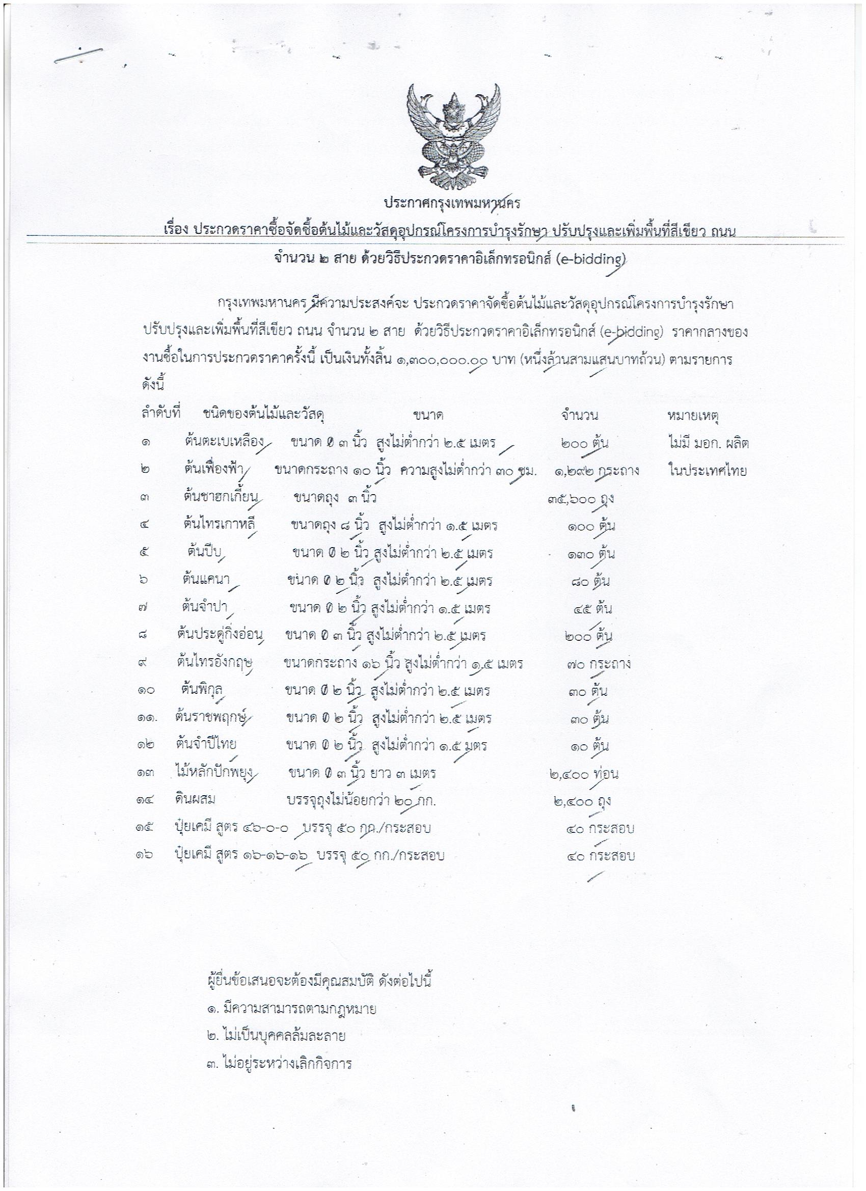 ประกาศราคาจัดซื้อต้นไม้และวัสดุอุปกรณ์โครงการบำรุงรักษา ปรับปรุงและเพิ่มพื้นที่สีเขียว ถนน 2 สาย ด้วยวิธีประกวดราคาอิเล็กทรอนิกส์ (15/11/2562)