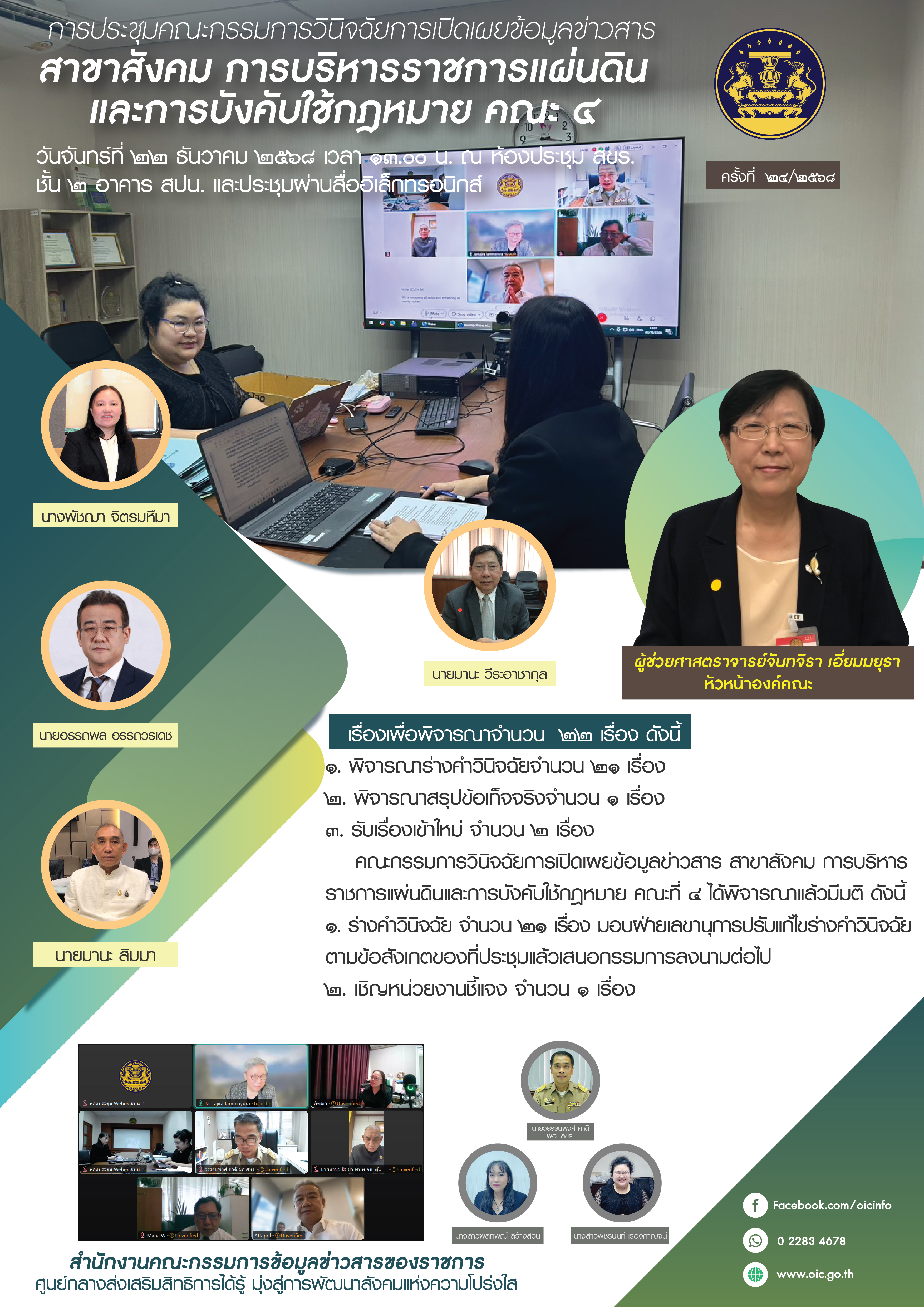 การประชุมคณะกรรมการวินิจฉัยการเปิดเผยข้อมูลข่าวสารสาขาสังคม การบริหารราชการแผ่นดินและการบังคับใช้กฎหมาย คณะที่ ๔ ครั้งที่ ๒๔/๒๕๖๘ วันจันทร์ที่ ๒๒ ธันวาคม ๒๕๖๘ เวลา ๑๓.๐๐ น. ณ ห้องประชุม สขร. ชั้น ๒ อาคาร สปน. และผ่านสื่ออิเล็กทรอนิกส์