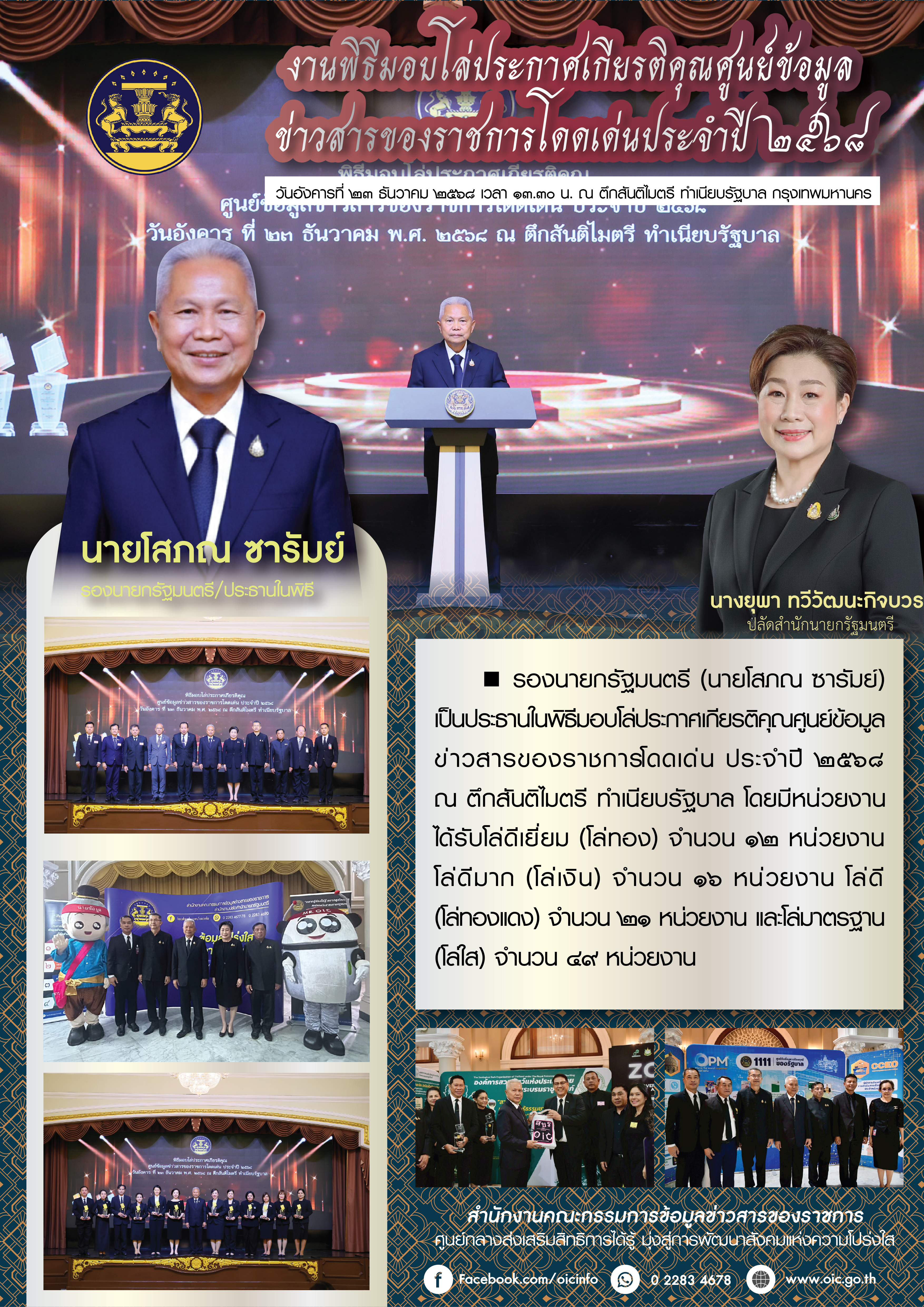 งานพิธีมอบโล่ประกาศเกียรติคุณศูนย์ข้อมูลข่าวสารของราชการโดดเด่น ประจำปี ๒๕๖๘ วันอังคารที่ ๒๓ ธันวาคม เวลา ๑๓.๓๐ น. ณ ตึกสันติไมตรี ทำเนียบรัฐบาล