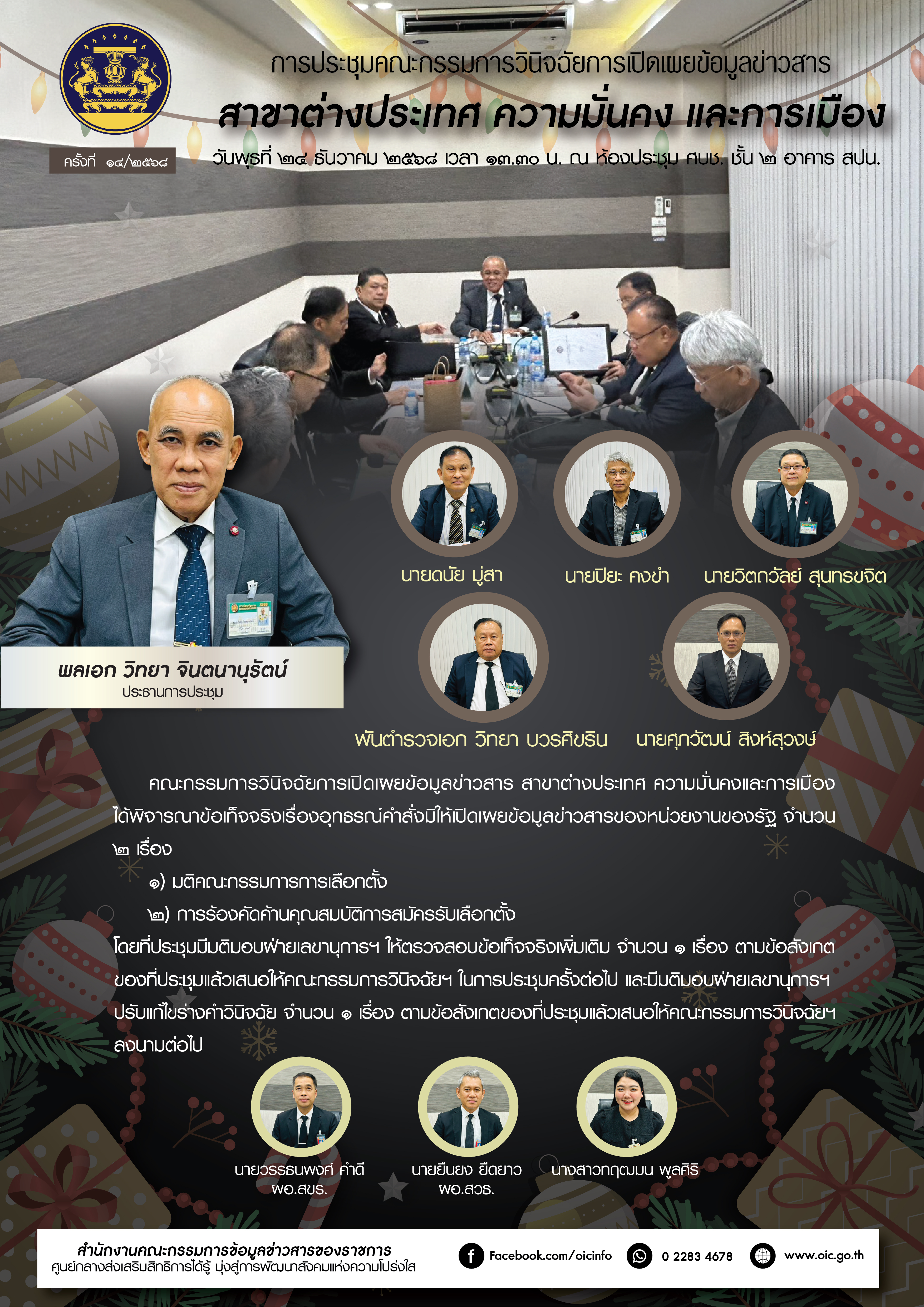 การประชุมคณะกรรมการวินิจฉัยการเปิดเผยข้อมูลข่าวสาร สาขาต่างประเทศความมั่นคง และการเมือง ครั้งที่ ๑๔/๒๕๖๘ วันพุธที่ ๒๔ ธันวาคม ๒๕๖๘ เวลา ๑๓.๓๐ น. ณ ห้องประชุม ศบช. ชั้น ๒ อาคาร สปน.