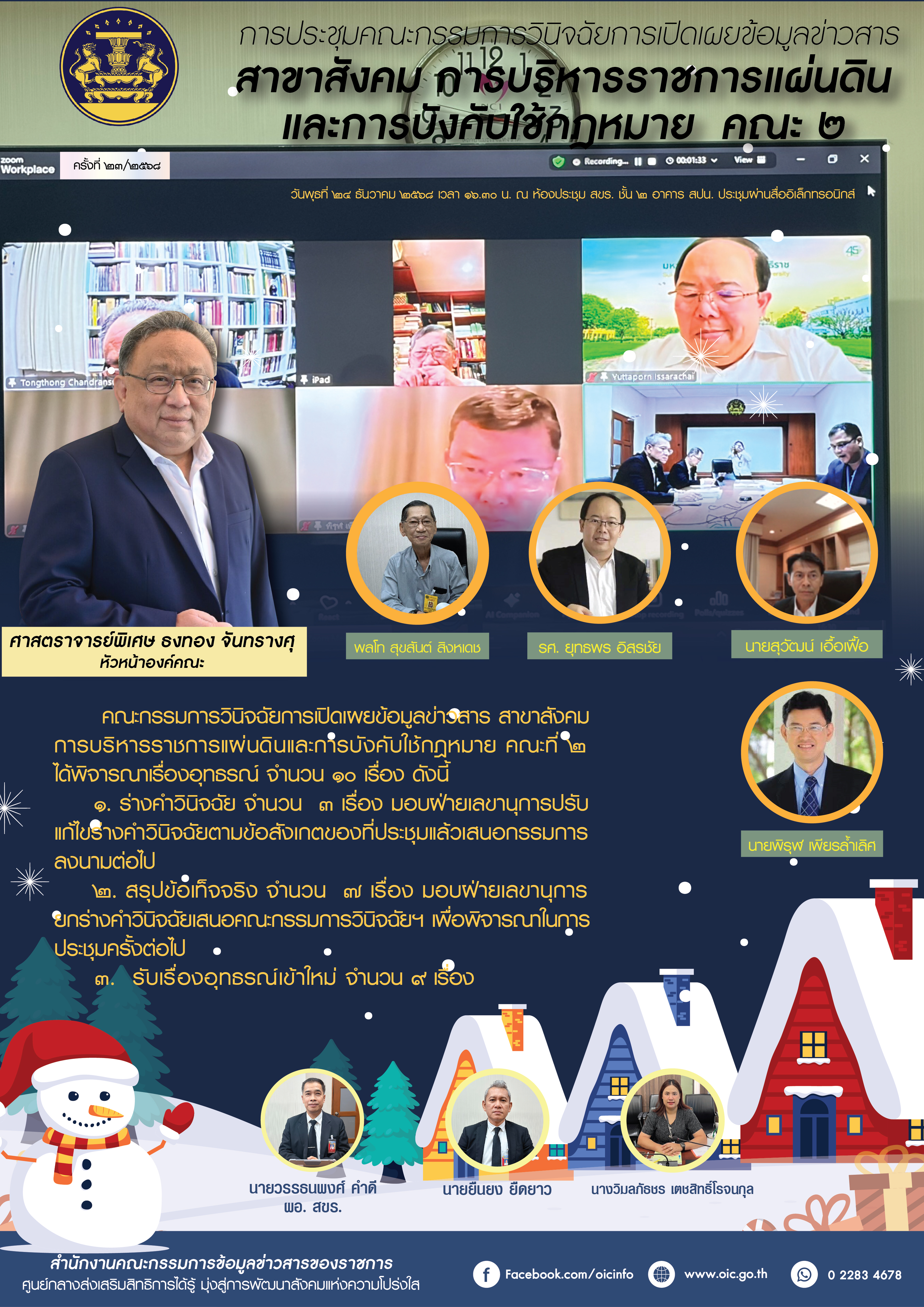 การประชุมคณะกรรมการวินิจฉัยการเปิดเผยข้อมูลข่าวสาร สาขาสังคม การบริหารราชการแผ่นดินและการบังคับใช้กฎหมาย คณะ ๒ ครั้งที่ ๒๓/๒๕๖๘ วันพุธที่ ๒๔ ธันวาคม ๒๕๖๘ เวลา ๑๖.๓๐ น. ณ ห้องประชุม สขร. ชั้น ๒ อาคาร สปน. และผ่านระบบประชุมทางไกล (Microsoft Teams)