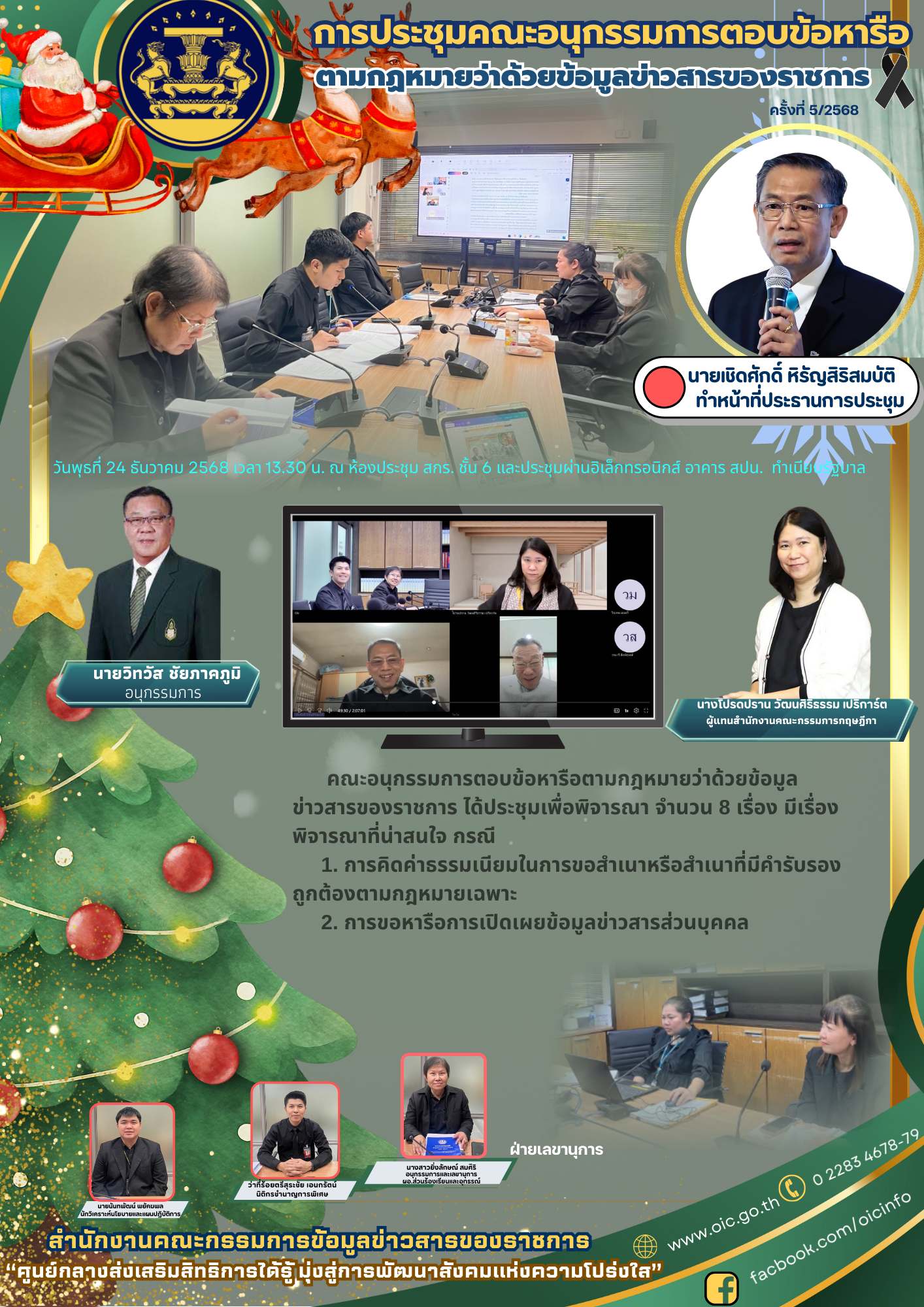 การประชุมคณะอนุกรรมการตอบข้อหารือตามกฎหมายว่าด้วยข้อมูลข่าวสารของราชการ วันพุธที่ ๒๔ ธันวาคม ๒๕๖๘ ครั้งที่ ๕/๒๕๖๘ เวลา ๑๓.๓๐ น. ณ ห้องประชุม สกร. ชั้น ๖ อาคาร สปน.