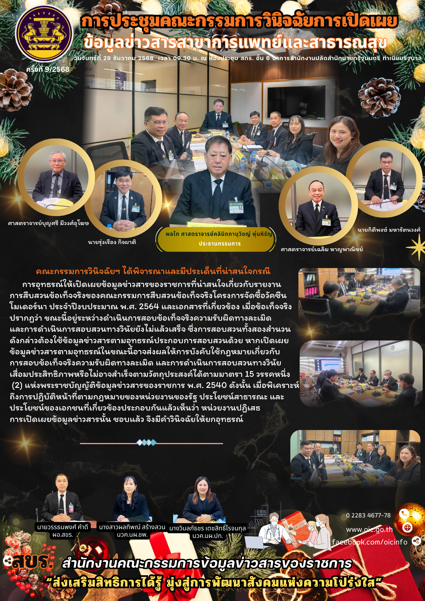 การประชุมคณะกรรมการวินิจฉัยการเปิดเผยข้อมูลข่าวสาร สาขาการแพทย์และสาธารณสุข ครั้งที่ ๙/๒๕๖๘ วันจันทรืที่ ๒๙ ธันวาคม ๒๕๖๘ เวลา ๐๙.๓๐ น. ณ ห้องประชุม สกร. ชั้น ๖ อาคาร สปน.