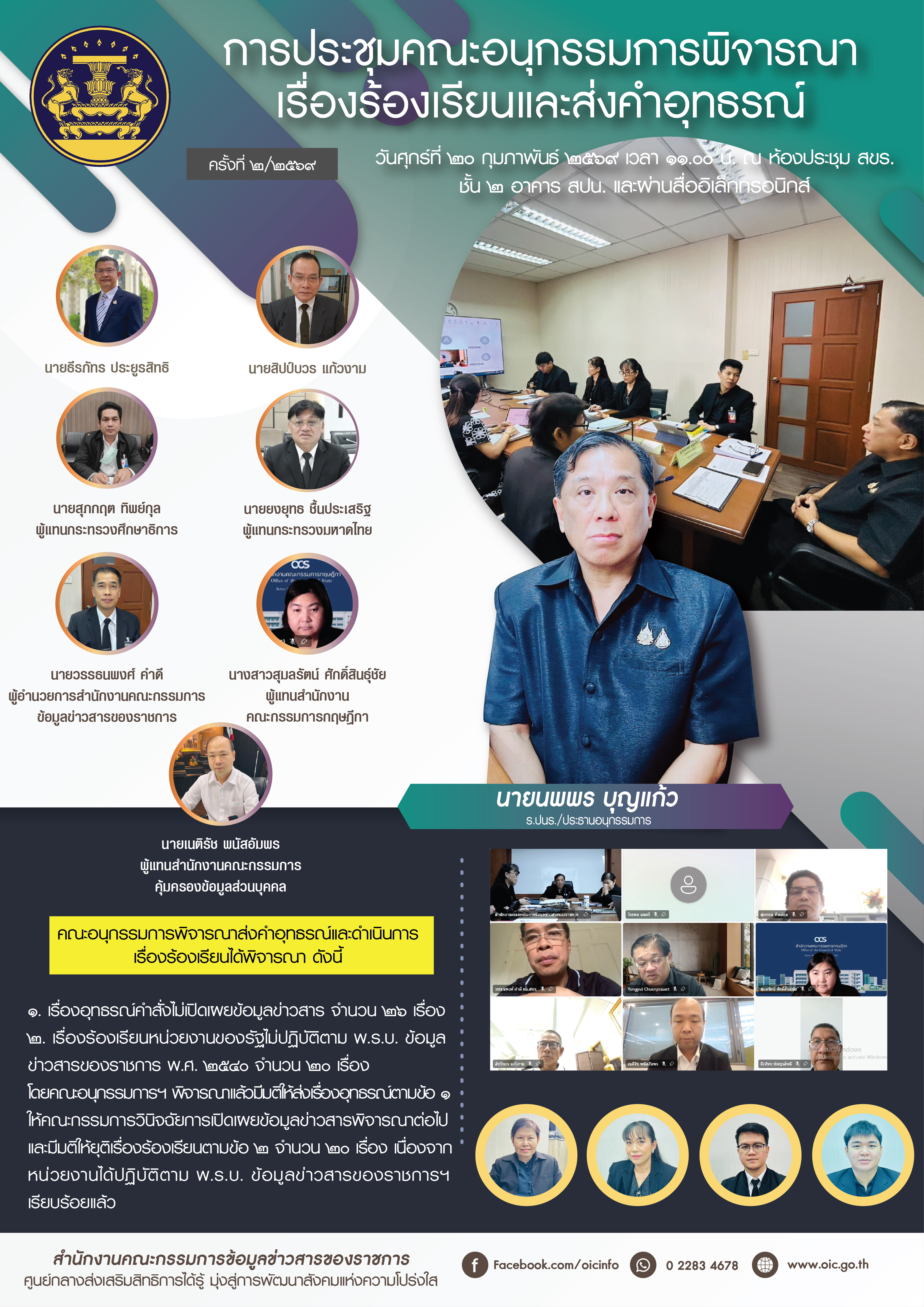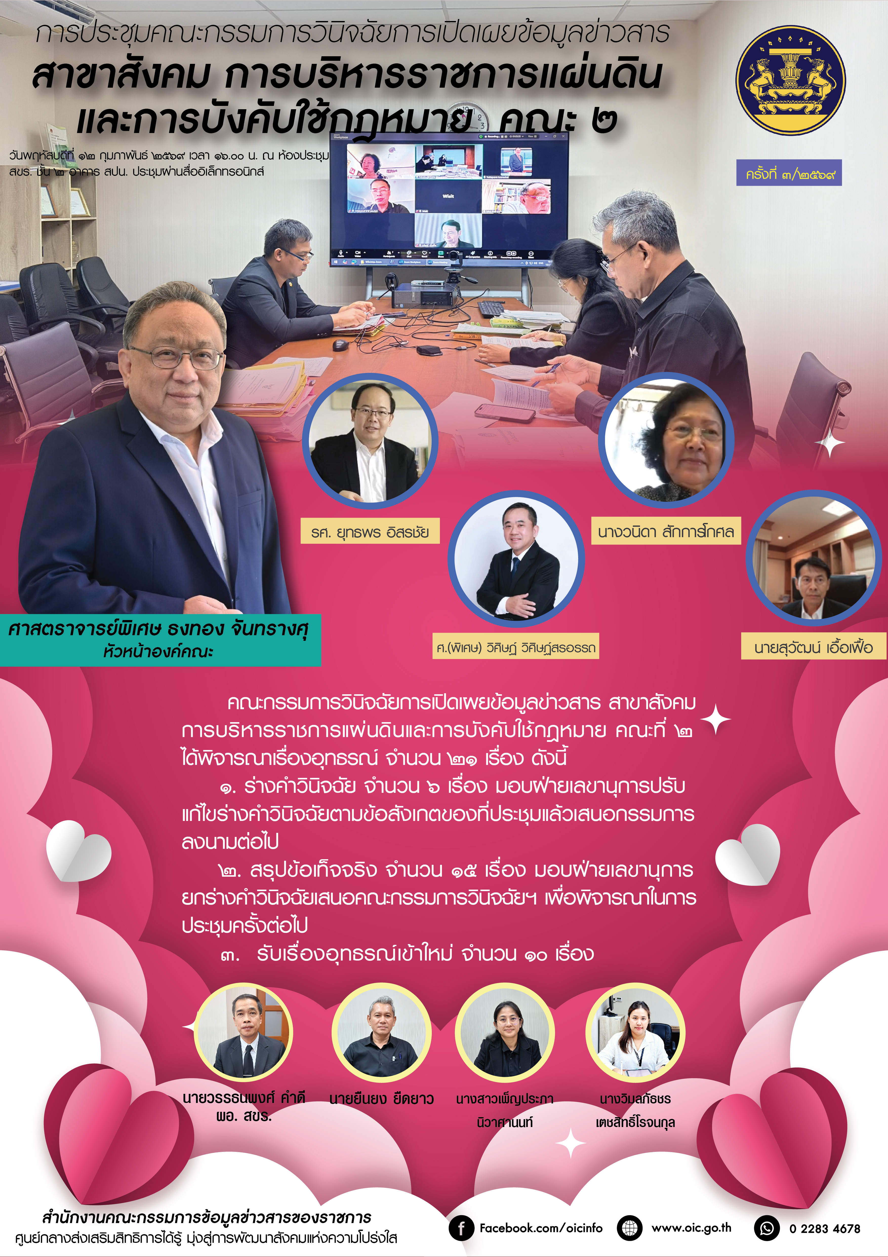 การประชุมคณะกรรมการวินิจฉัยการเปิดเผยข้อมูลข่าวสาร สาขาสังคม การบริหารราชการแผ่นดินและการบังคับใช้กฎหมาย คณะ ๒ ครั้งที่ ๓/๒๕๖๙ วันพฤหัสบดีที่ ๑๒ กุมภาพันธ์ ๒๕๖๙ เวลา ๑๖.๐๐ น. ณ ห้องประชุม สขร. ชั้น ๒ อาคาร สปน. และผ่านระบบประชุมทางไกล (Microsoft Teams)