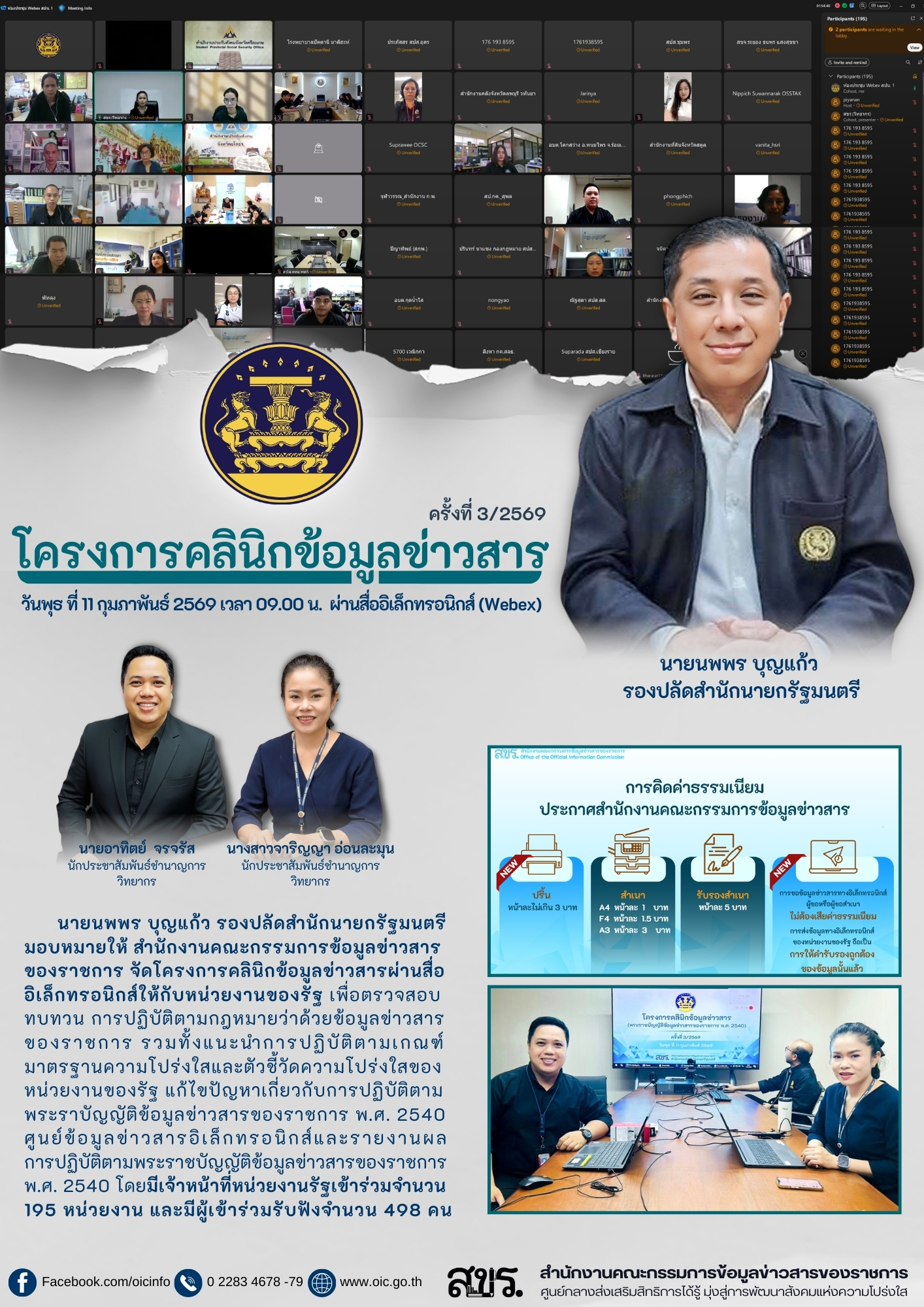 โครงการคลินิกข้อมูลข่าวสาร ครั้งที่ ๓/๒๕๖๙ วันพุธที่ ๑๑ กุมภาพันธ์ ๒๕๖๙ เวลา ๐๙.๐๐ น. ผ่านสื่ออิเล็กทรอนิกส์ (Webex)