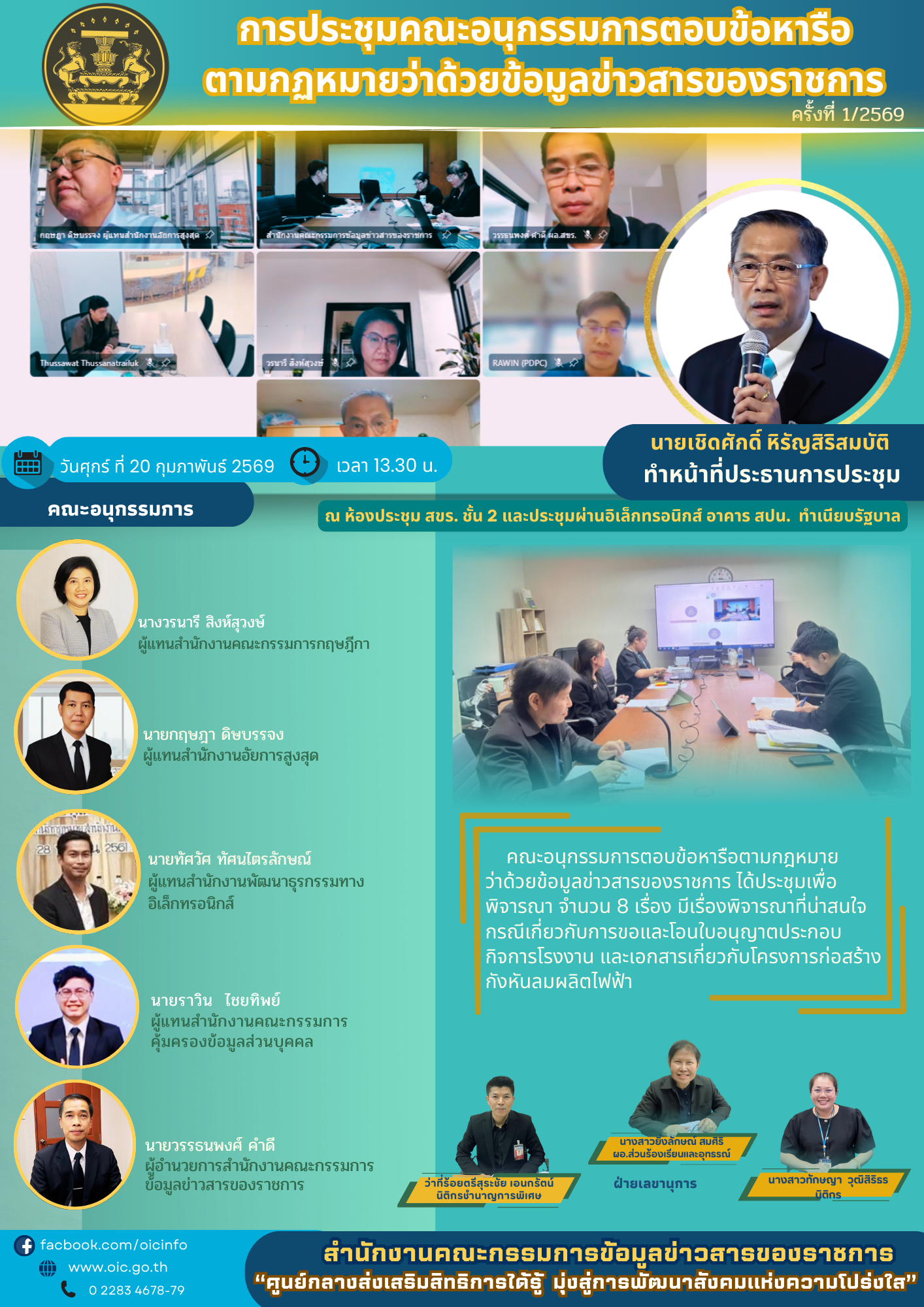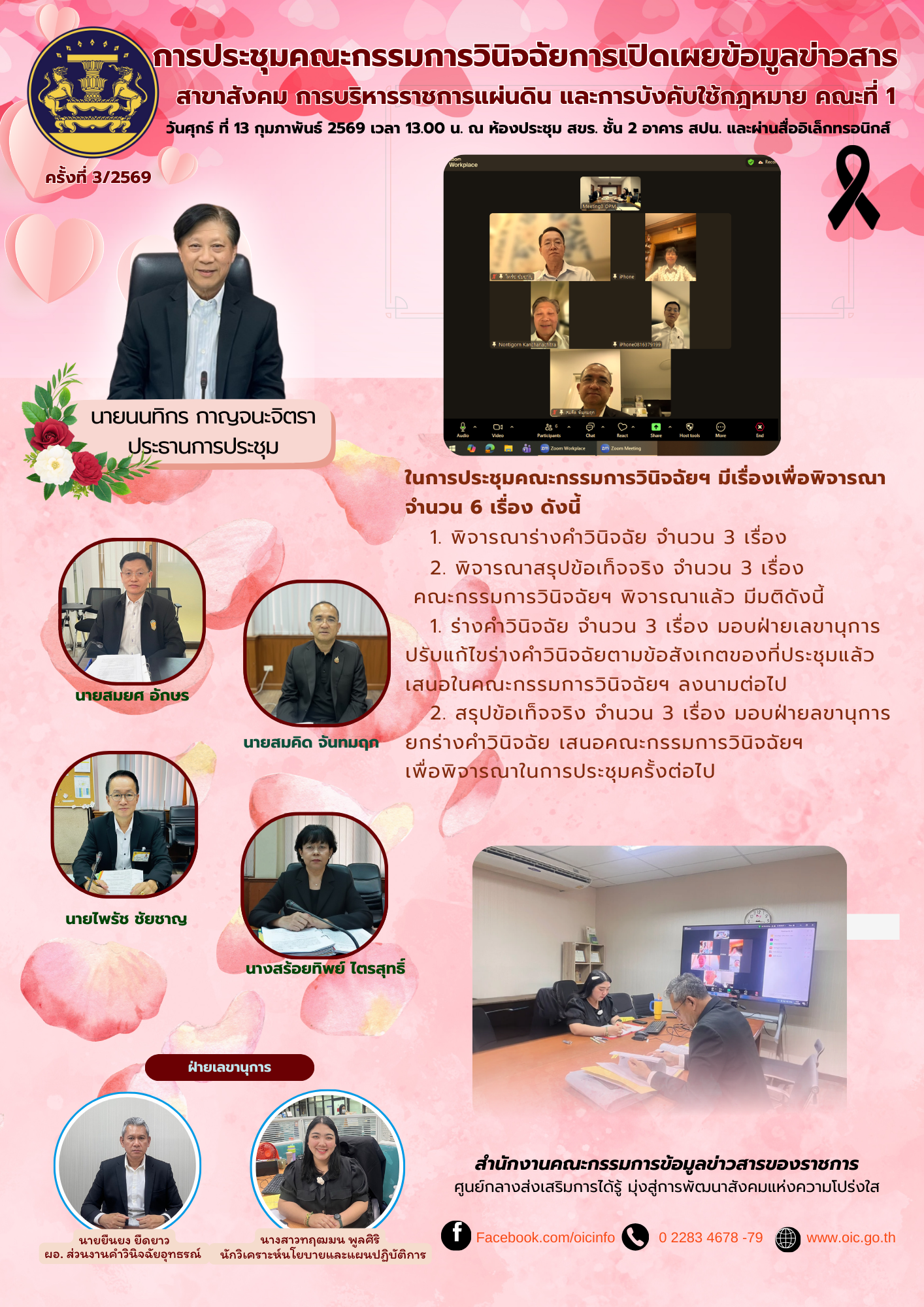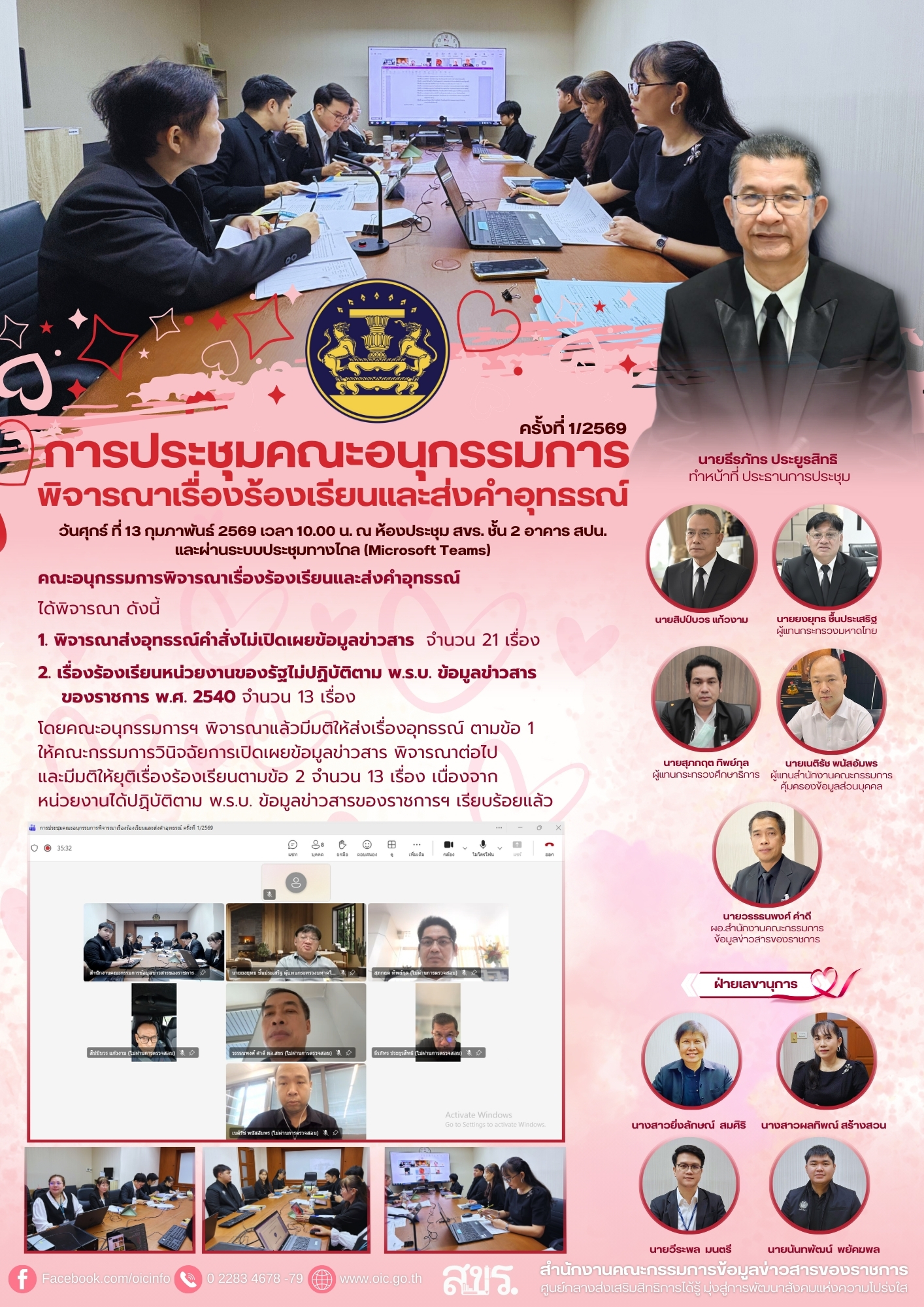 การประชุมคณะกรรมการวินิจฉัยการเปิดเผยข้อมูลข่าวสารสาขาสังคม การบริหารราชการแผ่นดินและการบังคับใช้กฎหมาย คณะที่ ๑ ครั้งที่ ๓/๒๕๖๙ วันศุกร์ที่ ๑๓ กุมภาพันธ์ ๒๕๖๙ เวลา ๑๓.๐๐ น. ณ ห้องประชุม สขร. ชั้น ๒ อาคาร สปน. และผ่านสื่ออิเล็กทรอนิกส์