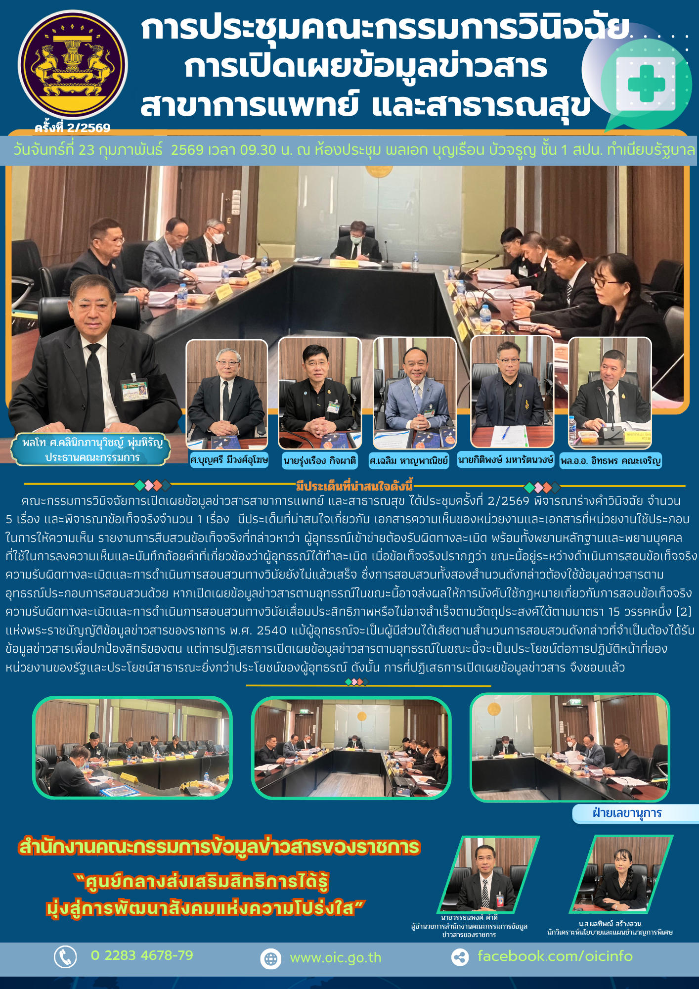 การประชุมคณะกรรมการวินิจฉัยการเปิดเผยข้อมูลข่าวสารสาขาการแพทย์และสาธารณสุข ประชุมครั้งที่ ๒/๒๕๖๙ วันจันทร์ที่ ๒๓ กุมภาพันธ์ ๒๕๖๙ เวลา ๐๙.๓๐ น. ณ ห้องประชุมพลเอก บุญเรือน บัวจรูญ ชั้น ๑ สำนักงานปลัดสำนักนายกรัฐมนตรี