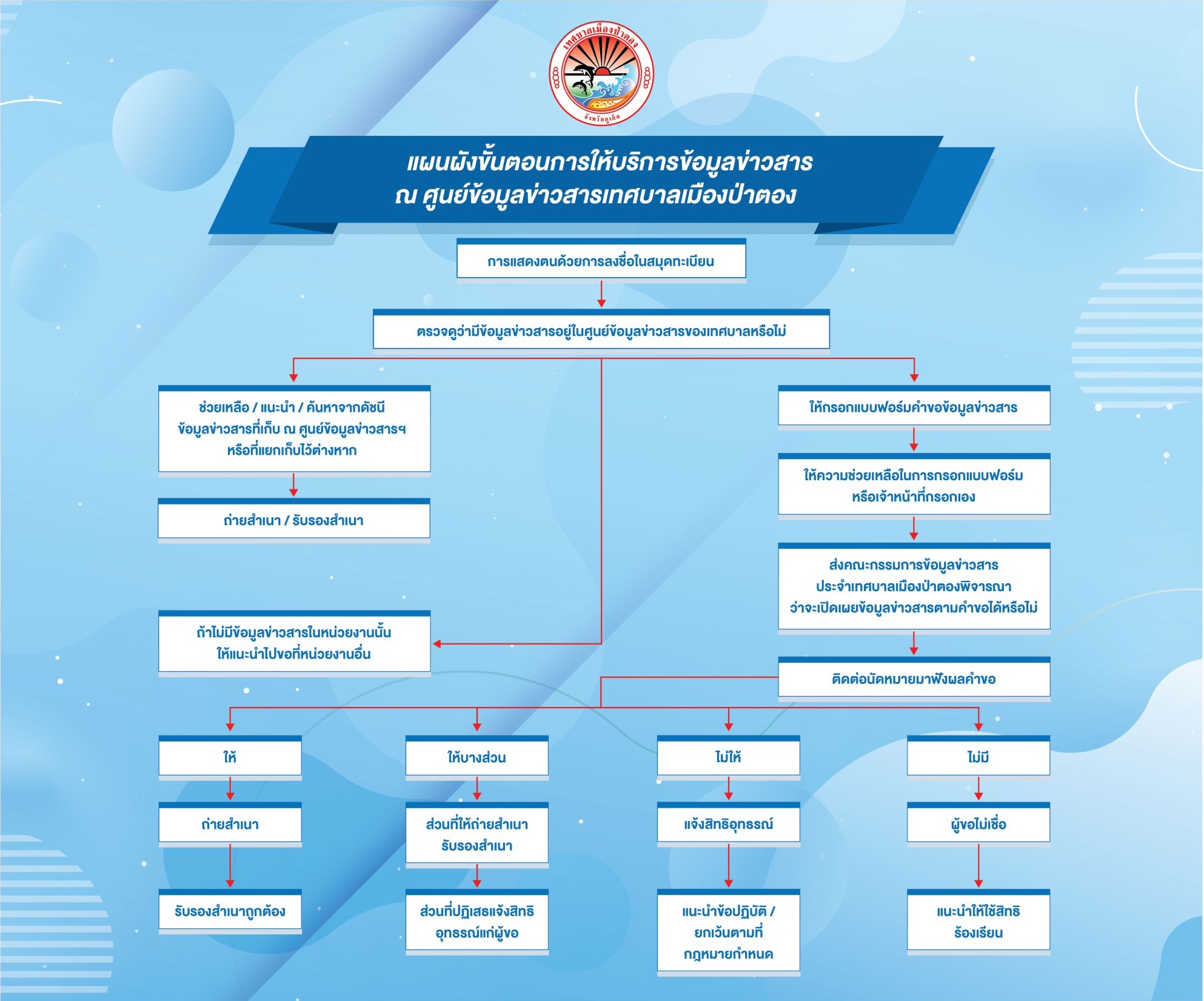 | 38 | เทศบาลนครปากเกร็ด จังหวัดนนทบุรี_อุทธรณ์คำสั่งมิให้เปิดเผยข้อมูลข่าวสารเกี่ยวกับแบบแปลนบ้าน | เทศบาลเมืองป่าตอง | |