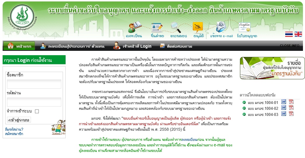 กระทรวงเกษตรและสหกรณ์ สำนักงานการปฏิรูปที่ดินเพื่อเกษตรกรรม เปิดโปรแกรมระบบยื่นคำขอรับใบอนุญาติแจ้งนำเข้า - ส่งออก สินค้าเกษตรตามมาตรฐานบังคับ (TAS - License)