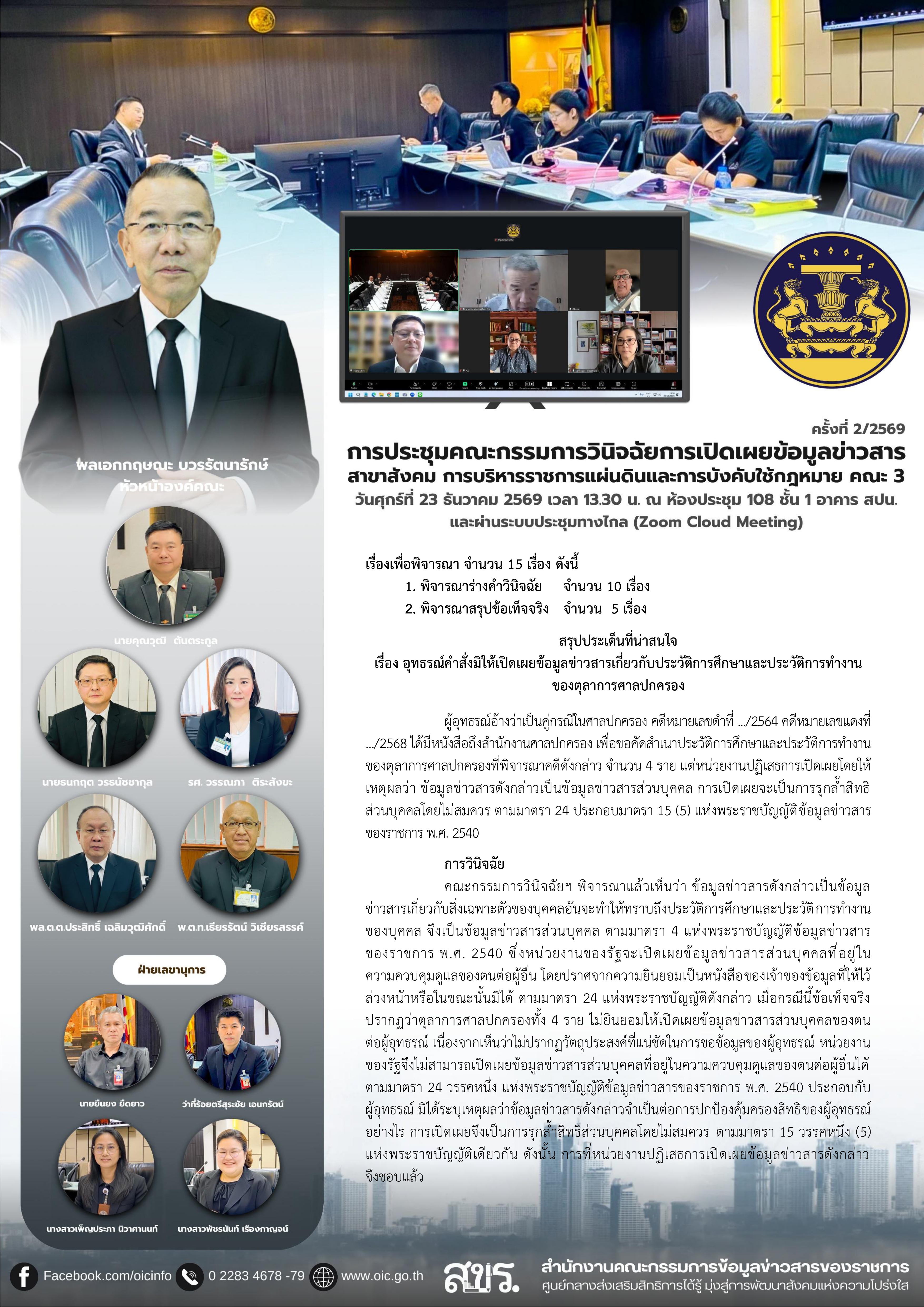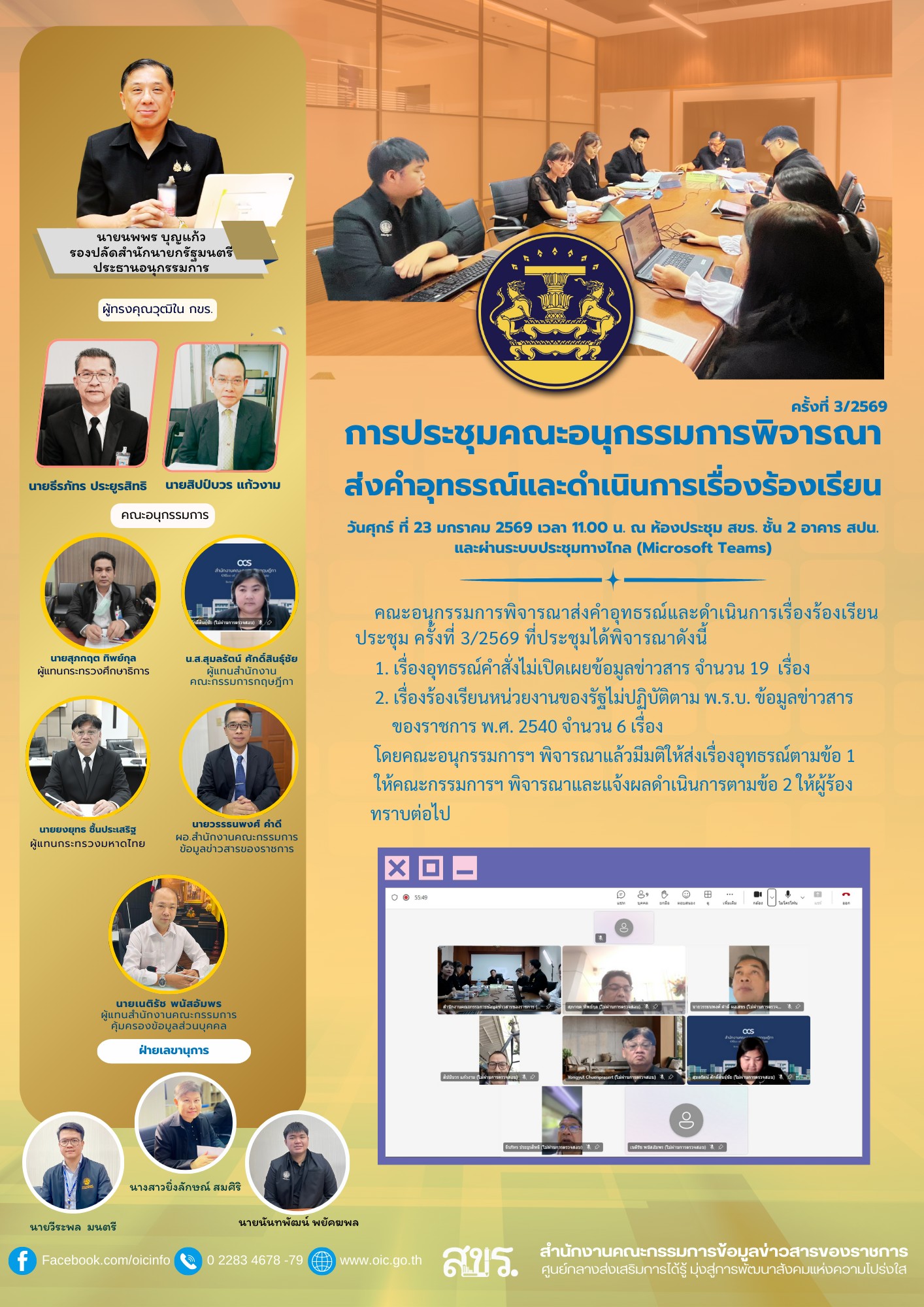 การประชุมคณะกรรมการวินิจฉัยการเปิดเผยข้อมูลข่าวสาร สาขาสังคม การบริหารราชการแผ่นดินและการบังคับใช้กฎหมาย คณะ ๓ ครั้งที่ ๒/๒๕๖๙ วันศุกร์ที่ ๒๓ มกราคม ๒๕๖๙ เวลา ๑๓.๓๐ น. ณ ห้องประชุม ๑๐๘ ชั้น ๑ อาคาร สปน. และผ่านระบบประชุมทางไกล (Zoom Cloud Meeting)