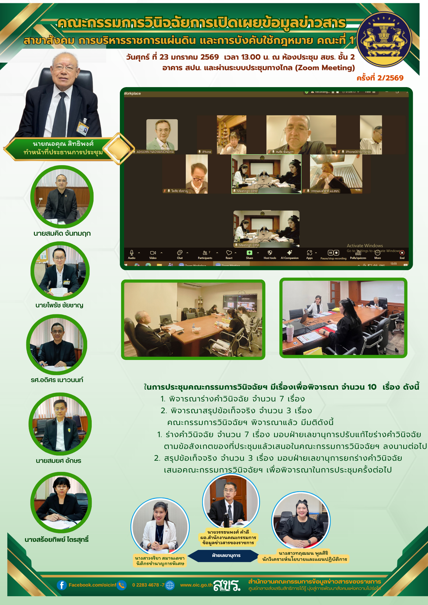 การประชุมคณะกรรมการวินิจฉัยการเปิดเผยข้อมูลข่าวสารสาขาสังคม การบริหารราชการแผ่นดินและการบังคับใช้กฎหมาย คณะที่ ๑ ครั้งที่ ๒/๒๕๖๙ วันศุกร์ที่ ๒๓ มกราคม ๒๕๖๙ เวลา ๑๓.๐๐ น. ณ ห้องประชุม สขร. ชั้น ๒ อาคาร สปน. และผ่านสื่ออิเล็กทรอนิกส์