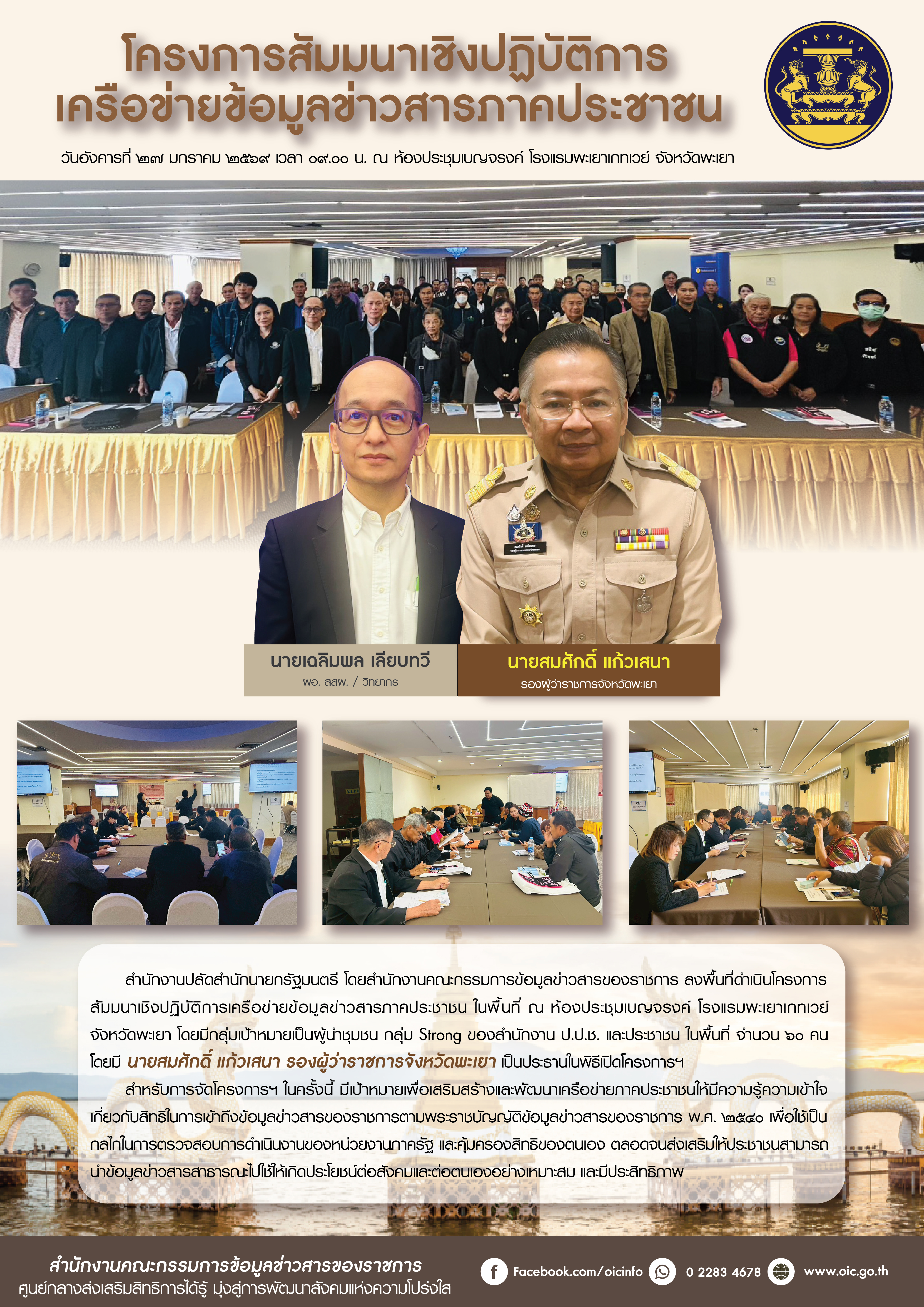 โครงการสัมมนาเชิงปฏิบัติการเครือข่ายข้อมูลข่าสารภาคประชาชน วันอังคารที่ ๒๗ มกราคม ๒๕๖๙ เวลา ๐๙.๐๐ น. ณ ห้องประชุม เบญจรงค์ โรงแรมพะเยา เกทเวย์ จังหวัดพะเยา