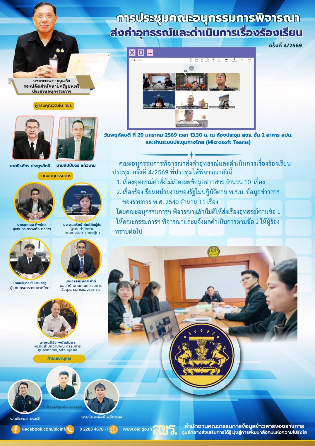 การประชุมคณะกรรมการวินิจฉัยการเปิดเผยข้อมูลข่าวสารสาขาสังคม การบริหารราชการแผ่นดินและการบังคับใช้กฎหมาย คณะที่ ๔ ครั้งที่ ๒/๒๕๖๙ วันจันทร์ที่ ๒๖ มกราคม ๒๕๖๙ เวลา ๑๓.๐๐ น. ณ ห้องประชุม ๑๐๘ อรรถไกวัลวที ชั้น ๑ อาคาร สปน. และผ่านสื่ออิเล็กทรอนิกส์