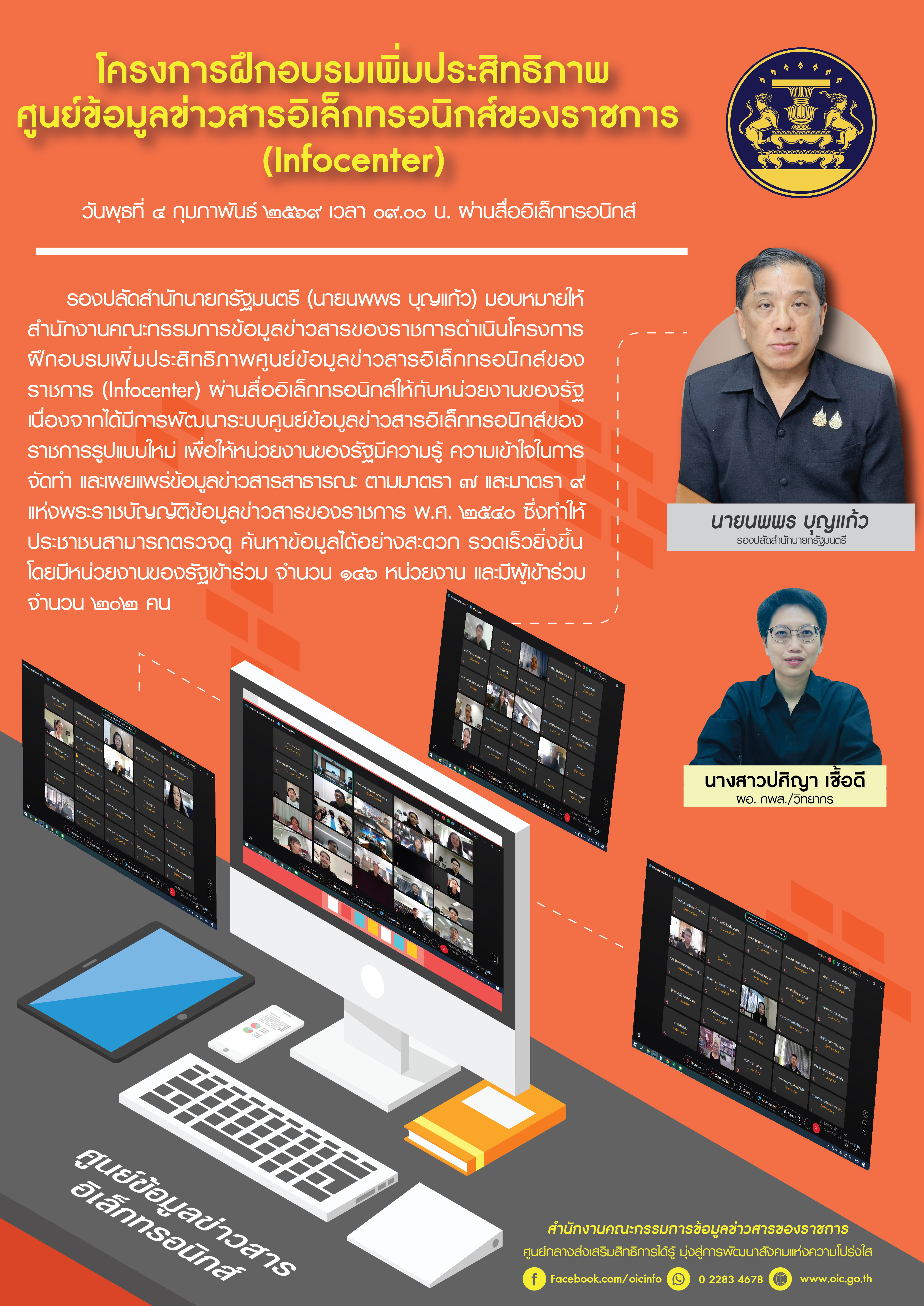 โครงการฝึกอบรมเพิ่มประสิทธิภาพศูนย์ข้อมูลข่าวสารอิเล็กทรอนิกส์ของราชการ (Infocenter) วันพุธที่ ๔ กุมภาพันธ์ ๒๕๖๙ เวลา ๐๙.๐๐ น. ผ่านสื่ออิเล็กทรอนิกส์